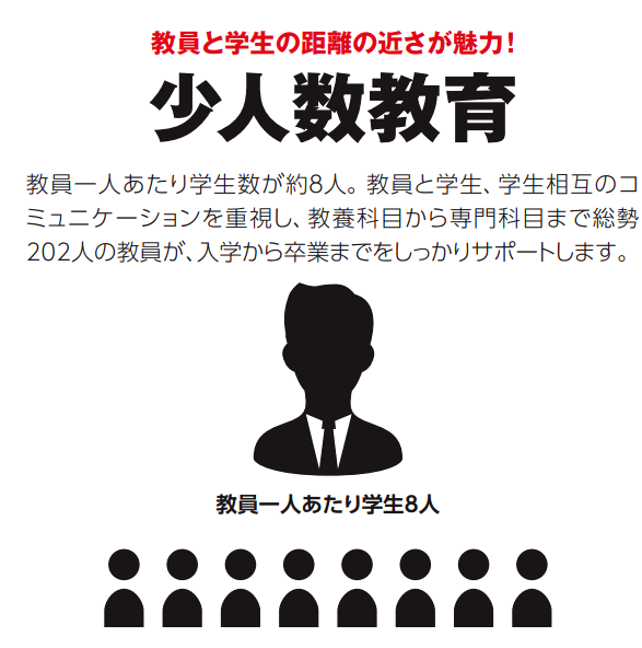 教員一人あたり学生数が約8人。教員と学生、学生相互のコミュニケーションを重視し、教養科目から専門科目まで総勢202人(令和3年4月1日現在)の教員が、入学から卒業までをしっかりサポートします。