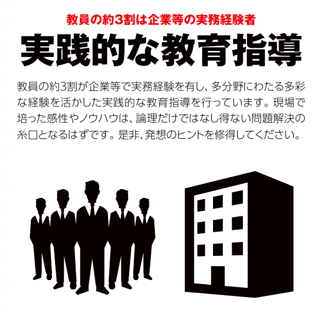 教員の約3割が企業等で実務経験を有し、多分野にわたる多彩な経験を活かした実践的な教育指導を行っています。現場で培った感性やノウハウは、論理だけではなし得ない問題解決の糸口となるはずです。学年担当教員・ 指導教員