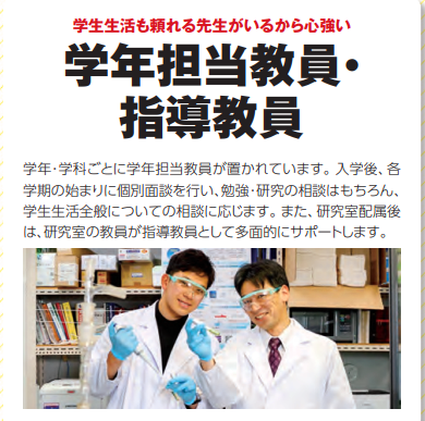 学年・学科ごとに学年担当教員が置かれています。入学後、各学期の始まりに個別面談を行い、勉強・研究の相談はもちろん、学生生活全般についての相談に応じます。また、研究室配属後は、研究室の教員が指導教員として多面的にサポートします。