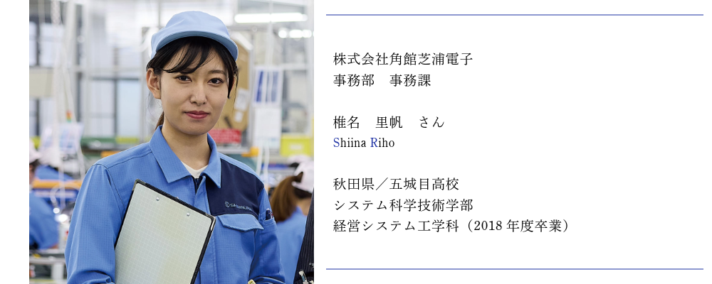 私は、秋田県仙北市に構える株式会社角館芝浦電子へ就職し、生産管理を経て現在は事務課で経理スタッフとして働いています。角館芝浦電子は温度センタの開発から製造を一貫して行っており、業界シェア世界一を誇る会社です。以前は生産管理で生産状況のデータを基に適正な生産計画の立案・必要人数の算出を行い、現在は経理で必要人数から人件費や諸経費を算出し、会社全体の利益予想と、結果を分析しております。分析結果から課題を抽出し、利益UPに繋げる解決策を講じる点は、学生時代の経験が活かされていると感じています。
