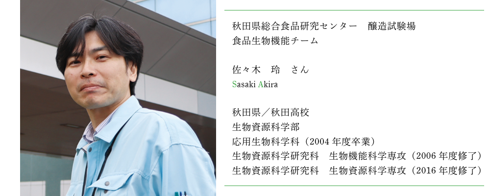 秋田県総合食品研究センターは、秋田県内における食品・酒類製造業の技術力向上や農林水産物の利用拡大を目的とした公設試研究機関です。私は、県産食材がもつ生理機能の解明や健康によい食品開発を支援する食品生物機能チームの一研究員として職務に取り組んでいます。