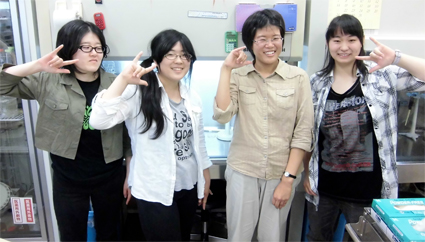 --------------------- 大学院博士課程 博士課程1年(12期)佐々木 玲 社会人(秋田県総合食品研究センター) --------------------- 大学院修士課程 修士課程2年(11期)佐藤 梓織(秋田県) マウスES細胞からTS細胞への分化転換に関する研究 ・第63回東北畜産学会大会優秀発表賞 修士課程2年(11期)佐藤 由貴(秋田県) 遺伝子ノックダウン法によるEGAM1ホメオタンパク質群の機能解析 ・大学院優秀学生奨学金授与生 修士課程1年(12期)菊地 貴裕(福島県) マウスiPS細胞の樹立に及ぼすEGAM1ホメオタンパク質群の影響に関する研究 ・第64回東北畜産学会大会優秀発表賞 修士課程1年(12期)野中 愛純(岩手県) EGAM1ホメオタンパク質群と相互作用する転写因子に関する研究 ・大学院優秀学生奨学金授与生 --------------------- 卒業論文研究 4年生(13期)楠原 夏生(福島県) piggyBac トランスポゾンシステムを用いた動物細胞の形質転換技術に関する研究 4年生(13期)熊谷 友希(秋田県) 遺伝子組換え技術による活性増強型マウスFGF4の開発 --------------------- 3年生配属 3年生(14期)平出 美鈴(山梨県) --------------------- ---------------------