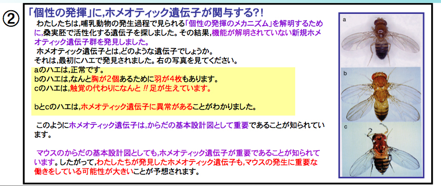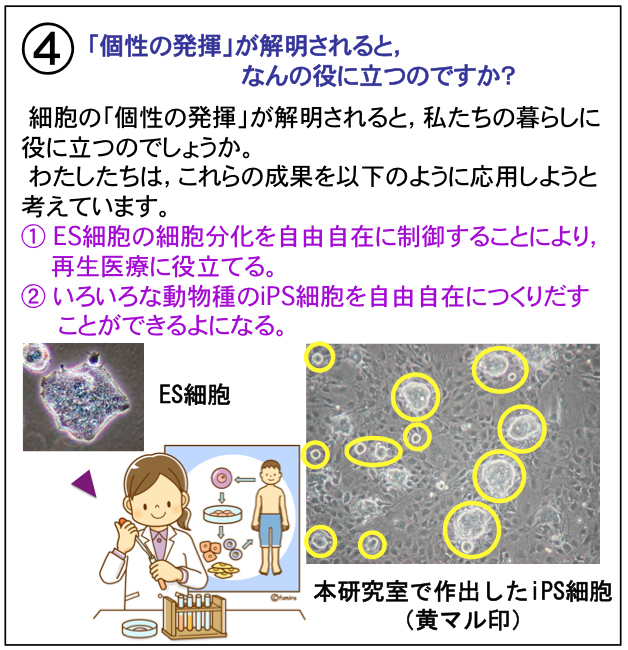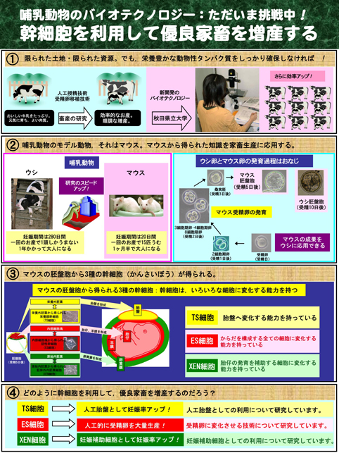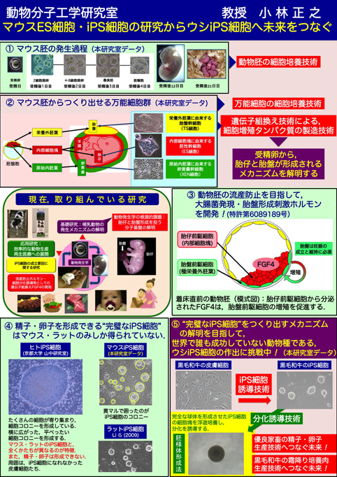 研究テーマ1: マウス初期胚・マウスES細胞で発現している,本研究室で発見した新規遺伝子群(EGAM1ホメオタンパク質群)による胚発生の調節機構に関する研究,および発生工学・再生医療への応用に関する研究 研究テーマ2: ・iPS細胞の根源的な成立要因に関する研究 研究テーマ3: ウシES細胞・ウシiPS細胞の特性(精子・卵子への分化誘導、培養肉の生成等)に関する研究 研究テーマ4: ES細胞・iPS細胞の細胞増殖を促進したり,動物胚の流産防止を目指した,遺伝子組換え細胞増殖因子に |