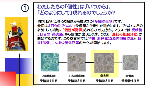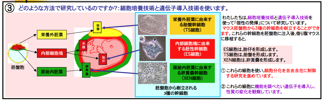 幹細胞の分子生物学:細胞運命決定機構の分子基盤を解明する 動物分子工学研究室では,幹細胞の細胞増殖と細胞分化の制御機構を解明すること目指し,特に哺乳動物の初期発生期に注目しています。そこで,具体的な研究材料としてマウス初期胚を用いています。この分野の研究は生命科学の中心課題でもあることから,世界中で多くの研究者の「興味のまと」になっています。 現在,哺乳動物の初期発生において重要であると考えられる複数の遺伝子を独自に単離し,機能解析をすすめています。そのためマウス初期胚のみならず,初期胚から単離することができる3種の幹細胞(胚性幹細胞(ES細胞)・胎盤幹細胞(TS細胞)・卵黄嚢幹細胞(XEN細胞))とiPS細胞を用い,細胞培養および遺伝子導入実験をおこなっています。 3台あるCO2インキュベーターは今日もフル稼働中。さらに組換えDNA実験では大腸菌の大量培養もこなします。 したがって,動物分子工学研究室では「細胞運命決定機構の分子基盤の解明」をとおして基礎生物学である発生生物学をまなび,癌や老化の細胞生物学・再生医療・動物生産の先端技術などの「応用生命科学」をまなび,胚操作・細胞培養・タンパク質精製・組換えDNA実験・遺伝子導入などのテクニックを身につけます。 具体的には。。。 マウス初期胚は,受精後2.5〜3日ほどで胎仔になる細胞系列(内部細胞塊)と,胎盤になる細胞系列(栄養外胚葉)に分化し始めます。この段階は哺乳動物における最初の細胞分化であると考えられますが,その詳細な調節機構は未解明です。下図では,この現象を「個性の発揮」として示しています。 マウス初期胚の発生段階特異的発現遺伝子ライブラリー(cDNAライブラリー,本研究室作製)から,「哺乳動物における最初の細胞分化」をつかさどる遺伝子群を探しだし,その遺伝子がもつ具体的な機能を調べています。 また,得られた成果を産業に活かすため,特に「研究テーマ2・3・4」では秋田県畜産試験場や企業と共同研究(マウスを使った基礎研究の成果をウシに応用する)をおこなっています。 |