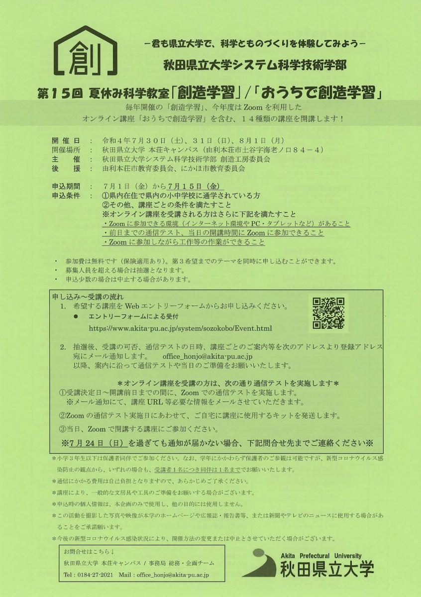 秋田県立大学システム科学技術学部創造工房委員会では、毎年秋田県内の小学生・中学生を対象に夏休み科学教室「創造学習」を開講しています。