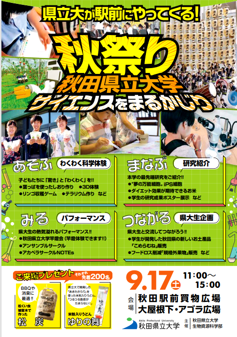 9月17日(土)11:00~15:00、秋田駅前買物広場大屋根下・アゴラ広場において、生物資源科学部が主催する『県大秋祭り~サイエンスをまるかじり~』が開催されます。