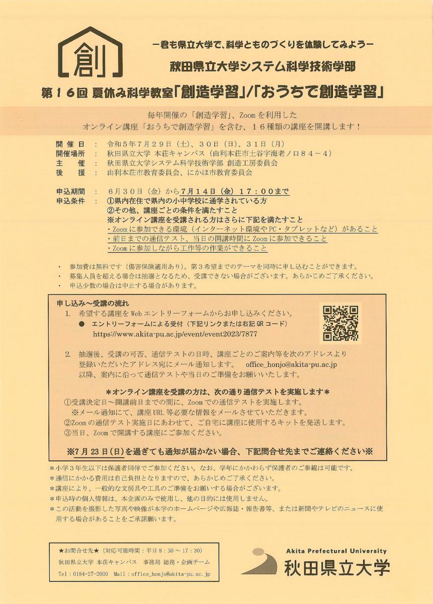 秋田県立大学システム科学技術学部創造工房委員会では、毎年秋田県内の小学生・中学生を対象に夏休み科学教室「創造学習」を開講しています。