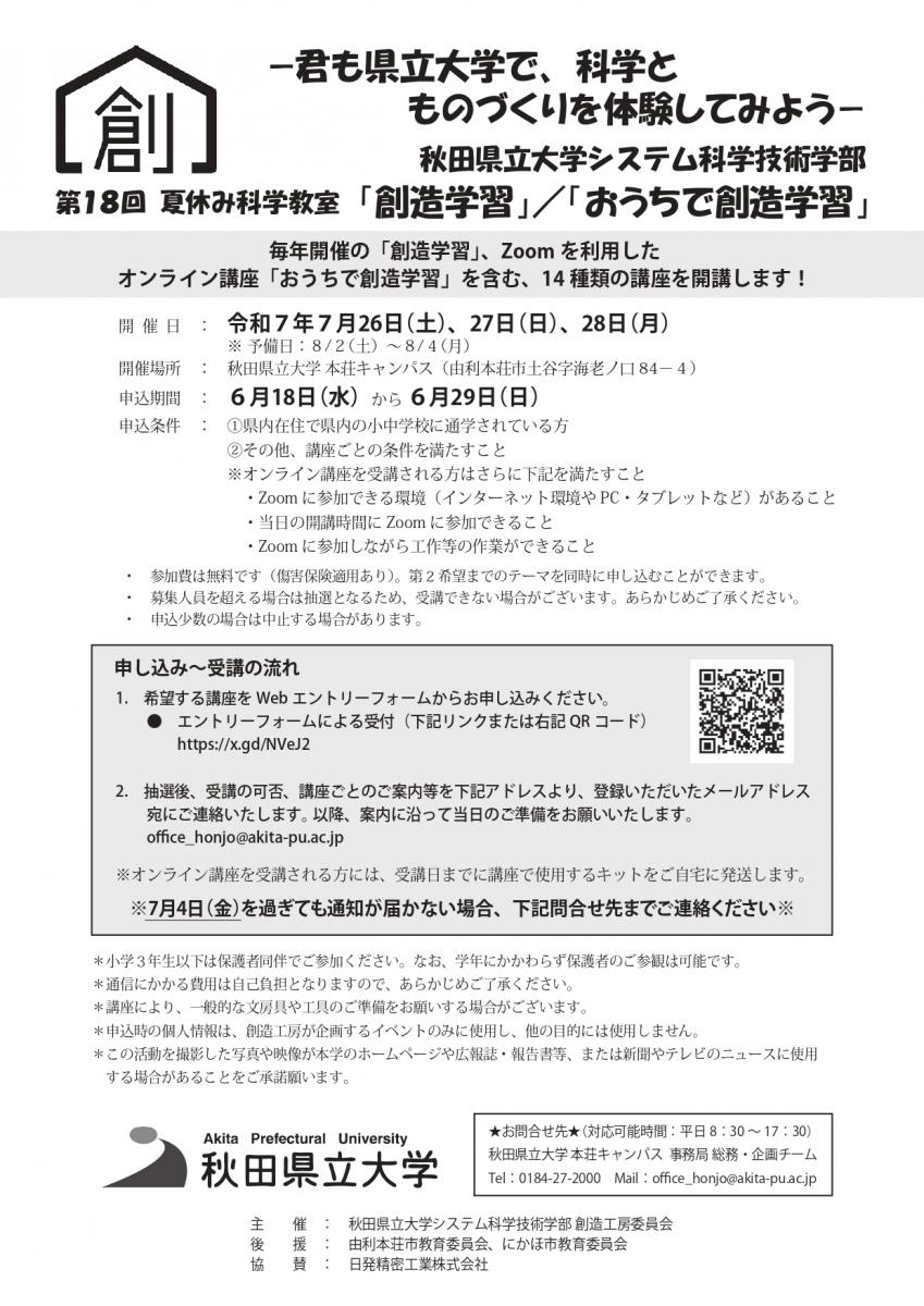 【主催】秋田県立大学 システム科学技術学部 創造工房委員会【後援】由利本荘市教育委員会、にかほ市教育委員会