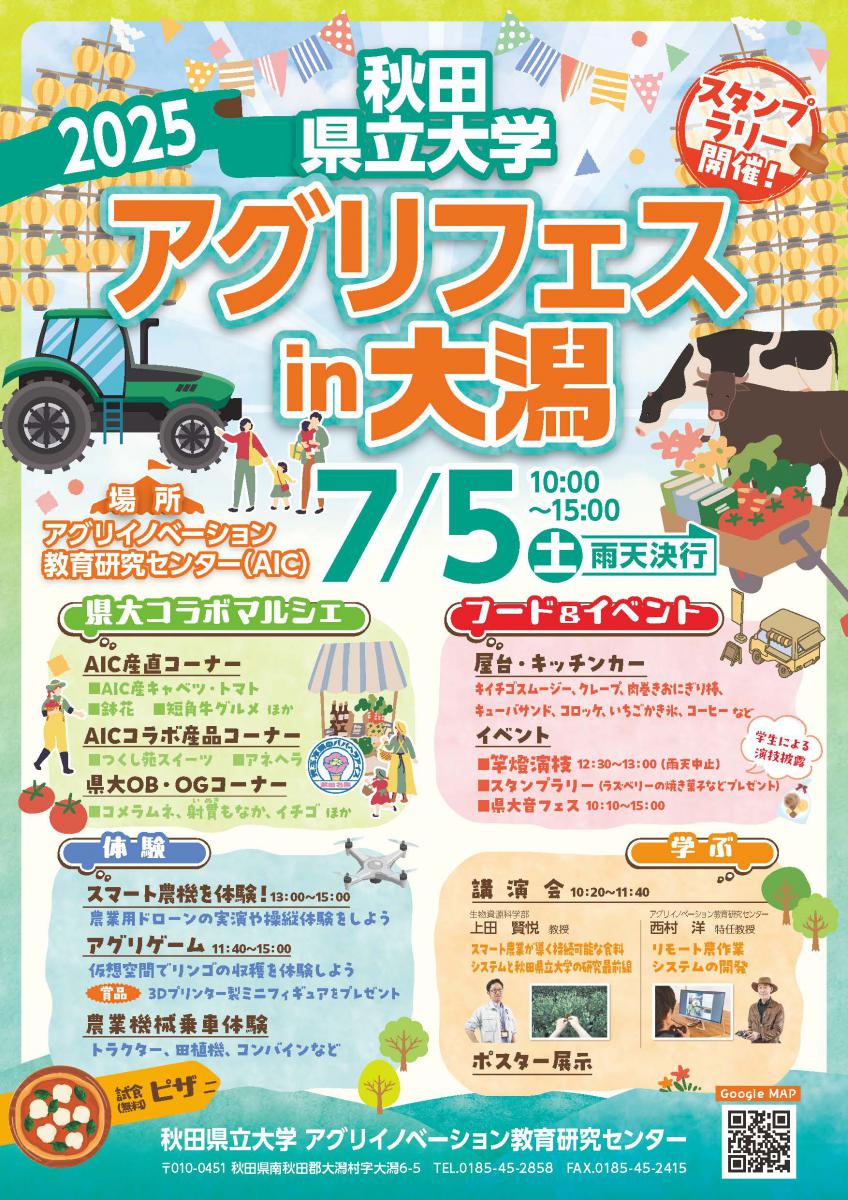 7月5日(土)10:00~15:00、アグリイノベーション教育研究センター(AIC)において、秋田県立大学『アグリフェスin大潟』を開催します!
