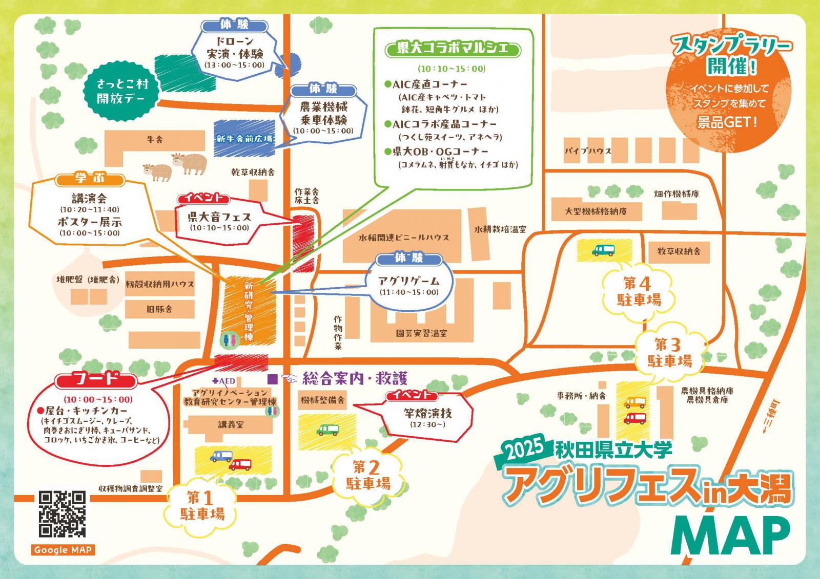 野菜やスイーツなどの販売、本学学生による竿燈演技披露や県大音フェス、ゲーム体験や農業機械乗車体験、本学教員による講演会など盛りだくさん!子どもから大人まで楽しめる内容となっております。是非ご来場ください!