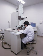 本学には透過型電子顕微鏡と走査型電子顕微鏡がそれぞれ設置されています。透過型電子顕微鏡は新種のウイルスの発見に、走査型電子顕微鏡はデンプンの解析など大学院生の研究に幅広く利用されています。また、大学院生を対象とした実習もあり、課題研究で電子顕微鏡を利用しない学生でも、使用方法を習得することができます。