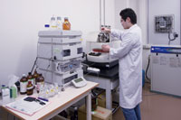 生物を構成する有機化合物の化学構造を解析する機器であり、わずか数ミリグラム程度の試料で炭素と水素の結合様式や立体構造について知ることができます。また、炭素や水素の同位体標識化合物を用いることにより代謝実験を行って、生体物質の生合成過程を証明することができます。