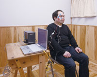 写真は眼球運動計測装置によって室内の快適性の評価を行っているところです。「目は口ほどにものを言う」との言葉がよく知られているように、人間の目の動きは人の心理状態と密接な関連があります。この装置を使うと、これまで数値的解析の難しかった心理的ストレスの測定を通して室内の快適性を科学的に評価できます。
