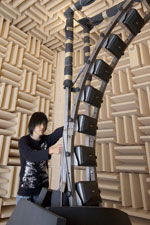 音に関する多方面の研究に利用できる施設であり、現在ヒトの聴覚に関する実験に使用しています。壁や天井にグラスウール製の吸音材を取り付け、床を固い反射性の材質と約200平方メートルの内容積をもつ半無響室であり、目的とする音だけを室内に発生させるために静かでかつ響きのない空間を作り出します。