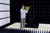 電子機器やアンテナなどから放射される電波を正確に測定するために使われます。外部からの電波の影響を受けないように電磁シールドが施されており、壁の内側に電波吸収体を配置して電波が反射しないような構造になっています。本学には10m×5m×6mの大きさの電波無響室があり、電波の理想的な測定環境を実現できます。