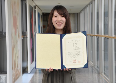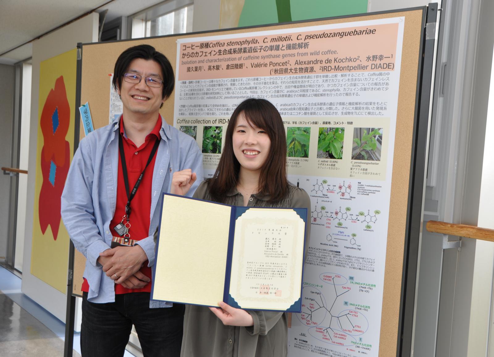 3月24〜27日、東京農業大学世田谷キャンパスで行われた「2019年度日本農芸化学会大会」において、生物資源科学部応用生物科学科4年(現大学院生物資源科学研究科1年)の國久葉月さん(指導教員:応用生物科学科 水野幸一准教授)が学会トピックス賞を受賞しました。日本農芸化学会はバイオサイエンス・バイオテクノロジーを中心とする多彩な領域の研究者、技術者、学生等約1万人によって構成される国内最大規模の学会です。年1回行われる大会で選出されるトピックス賞は、今年度の一般講演演題1676件から選ばれた優秀発表演題200題の中から、さらに学術的あるいは社会的インパクトのある発表が選出され、今年は29題が選ばれました。