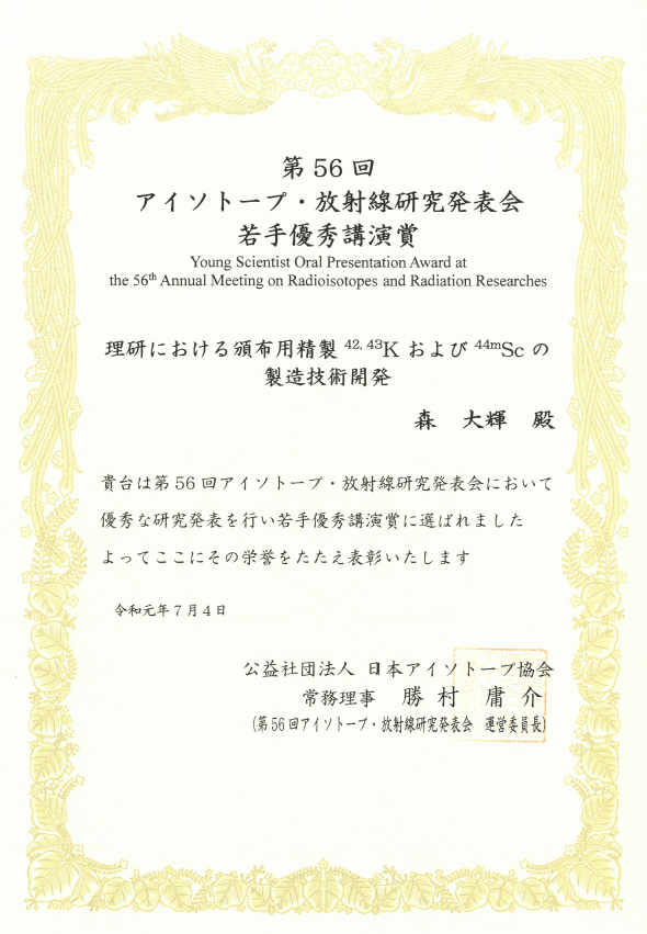 本学大学院生物資源科学研究科博士前期課程を修了した森大輝さん(平成29年3月修了、食品醸造グループ/指導教員:秋山美展教授)が、7月3日~5日に東京大学弥生キャンパスで開催された第56回アイソトープ・放射線研究発表会において、「若手優秀講演賞」を受賞しました。森さんは、公益社団法人日本アイソトープ協会の研究員として採用され、現在は国立研究開発法人理化学研究所に出向しております。理化学研究所ではAVFサイクロトロンを利用し、癌の治療に効果が期待されている67Cuや211Atなどの市販されていない有用RI (Radio Isotope) の製造技術開発を行い、国内の大学や研究機関に頒布を行っておりますが、更に次世代イメージング用RIとしてアルツハイマー型認知症や癌の早期診断への応用が期待されている42K(半減期T1/2 = 12.36 h)、43K(T1/2 = 22.3 h)、44mSc(T1/2 = 58.6 h)の製造技術開発をすすめております。これらの研究成果が高く評価され、この度の若手優秀講演賞の受賞につながりました。