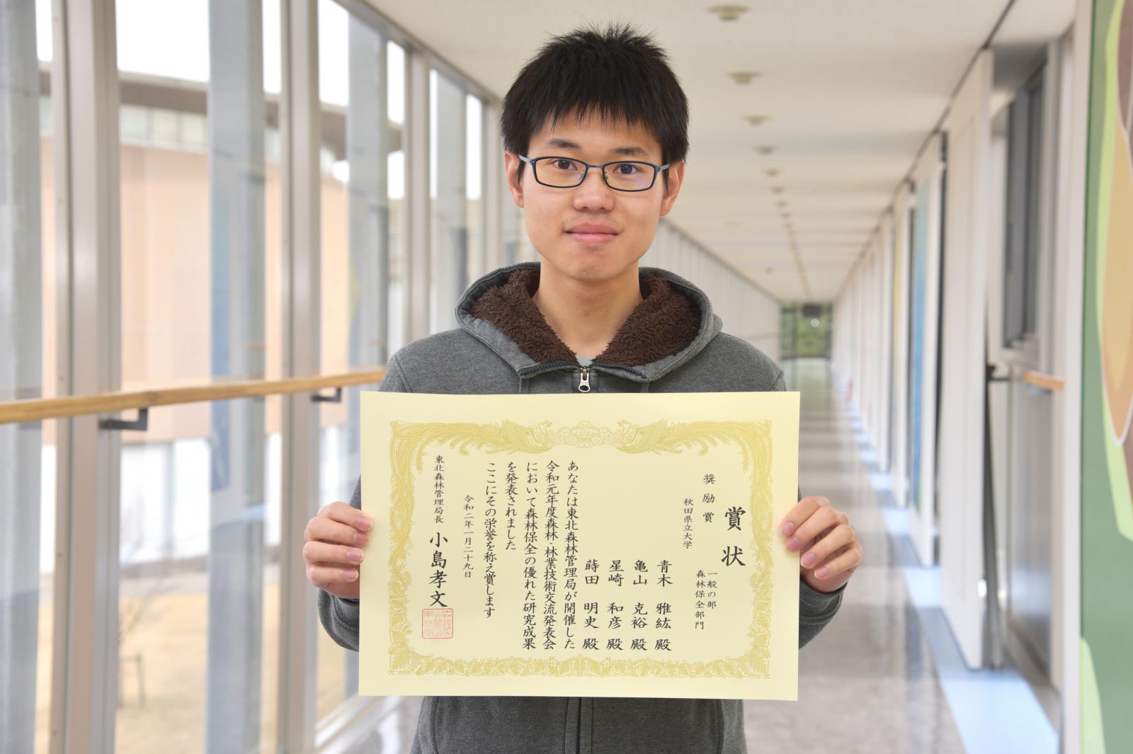 1月28日(火)~29日(水)にかけて秋田アトリオンで開催された、東北森林管理局が主催する「令和元年度 森林・林業技術交流発表会」において、本学大学院生物資源科学研究の青木雅紘さん(生物資源科学専攻1年)が東北森林管理局長賞(森林保全部門)奨励賞を受賞しました。青木さんは、森林科学研究室の仲間たちの協力の下、6期生亀山克裕さんの卒業研究結果を再測し、前向きに解析した結果、本賞の受賞に繋がりました。
