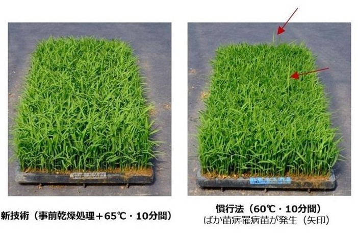 水稲種子には、水稲栽培における重要病害が潜んでいます。これら病害の発生を未然に防ぐため、化学合成農薬による種子消毒が広く行われています。しかしながら、化学合成農薬に依存しない米作りに対応するため、60℃の温湯に10分間種子を浸けて病原菌を死滅させる温湯消毒技術が開発され広く普及してきました。しかしながら、この技術は化学合成農薬よりも消毒効果が劣り、結果として、ばか苗病が多発し大きな問題となりました。60℃以上の温度で消毒すると種子が死んでしまうため、これまでの技術では、これ以上温度を上げることができませんでした。しかしながら、これまで60℃でしか行うことができなかった温湯消毒(慣行法)が、種子を事前乾燥することで、より高温の65℃で行うことができるようになり(新技術)、イネに潜んでいる病原菌に対して、従来法よりも防除効果が高く、特に近年温暖化により問題となっている、もみ枯細菌病や苗立枯細菌病に対しては化学合成農薬よりも高い防除効果が得られる技術であることを明らかにしました。また、この新技術は、近年問題となっている薬剤耐性菌にも対応できる技術です。