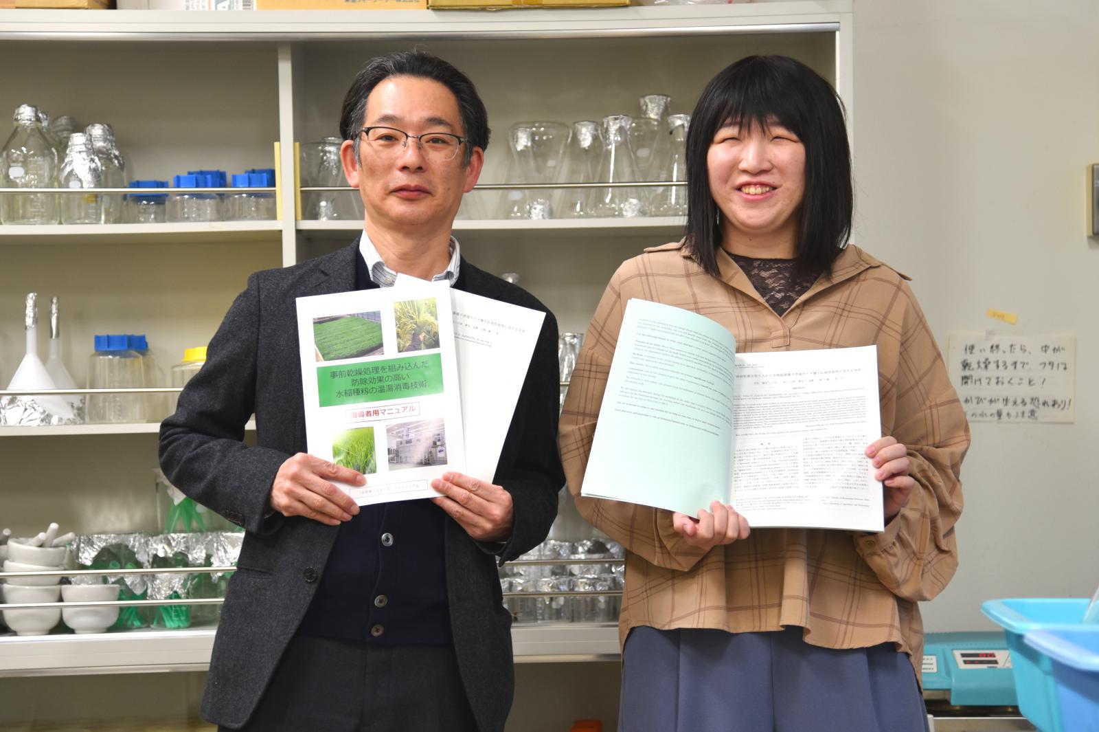 この研究テーマを卒業論文、修士論文として取り組んだ伊賀優実さんは、秋田県立金足農業高校卒業後、本学に進学した学生です。実家が水稲農家であることから、この研究に取り組みました。高校で培った ”雑草魂” で実験室内での研究から農家での実証試験まで精力的にこなし、今回の論文掲載にまで至りました。4月からは本学の博士後期課程に進学し更に研究を深めることになっております。