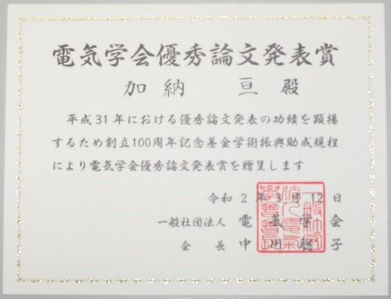 本学大学院生が「電気学会優秀論文発表賞」を受賞しました