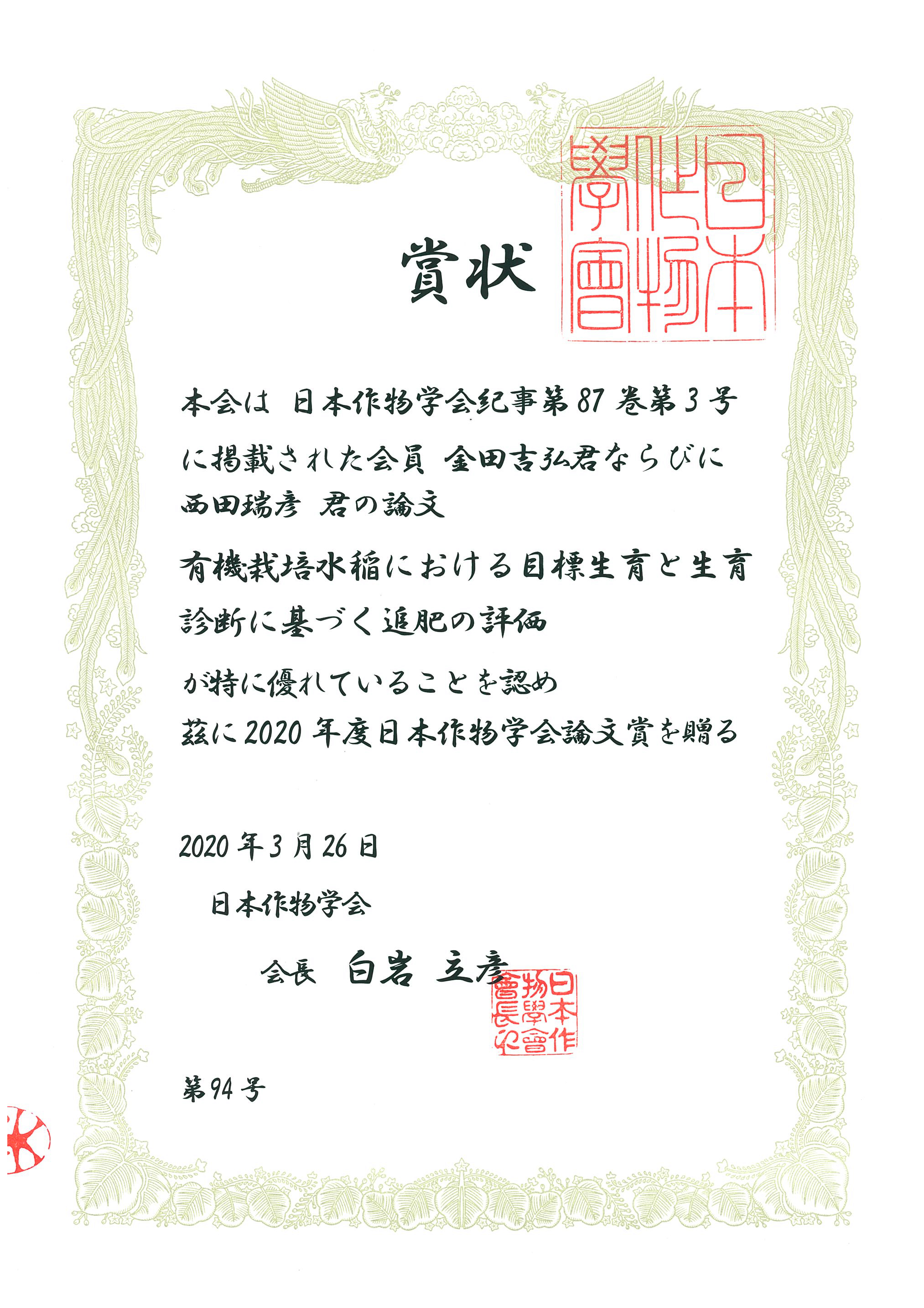 本学の金田 吉弘 名誉教授(前生物資源科学部長。2020年3月末で退任)の論文『有機栽培水稲における目標生育と生育診断に基づく追肥の評価(金田吉弘・西田瑞彦)』が、2020年度日本作物学会論文賞を受賞しました。今回受賞した論文は、慣行農法に比べて収量が低下しやすい有機水稲栽培において、目標生育の設定と生育診断に基づく追肥により、慣行栽培並みの収量が得られることを実証したものであり、生産現場における応用と展開が期待されます。