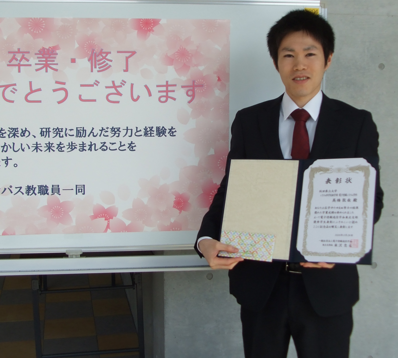 システム科学技術研究科電子情報システム学科の髙橋敦哉さん(2020年3月卒業)が、2019年度優秀学生表彰を受賞しました。この賞は、電子情報通信学会東北支部に所属する大学及び高等専門学校等において、電子工学及び情報通信の将来を担いうる優秀な学生に対し、その功績を称えるとともに今後の活躍を祈念して授与されるものです。