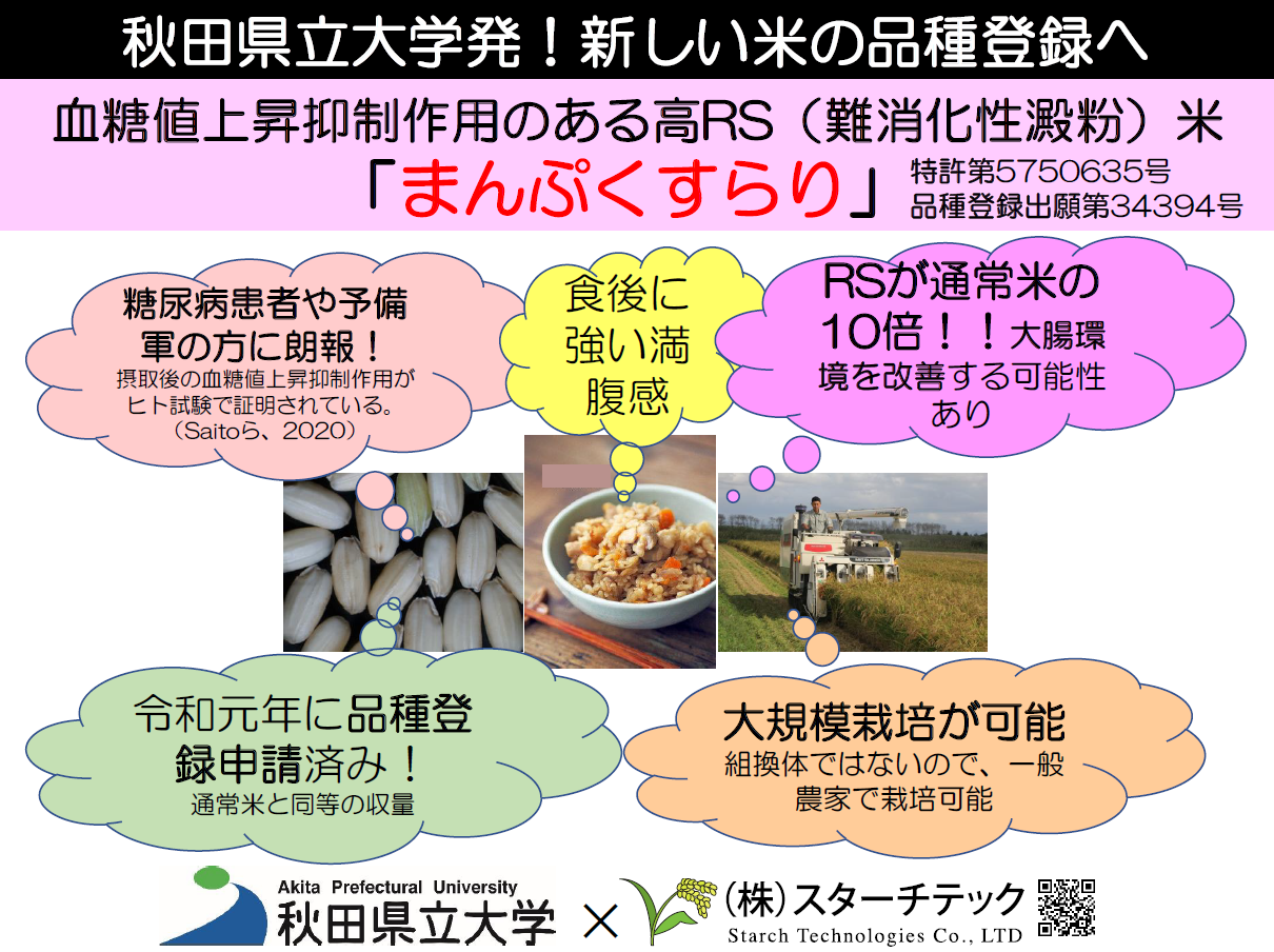 生物資源科学部の藤田 直子 教授(生物生産科学科)の研究グループが中心になって開発している高RS(難消化性澱粉)米「A6」が、令和2年4月13日付で『まんぷくすらり』という品種名で品種登録出願公表となりました(品種登録出願第34394号)。この品種は、難消化性澱粉が通常の米の10倍程度高く、この米を使った米飯や米菓で食後の血糖値上昇抑制が認められている機能精米です。今後、米菓やきりたんぽ、ダイエットおこわ等、様々なレシピに応用され、販売していく予定です。