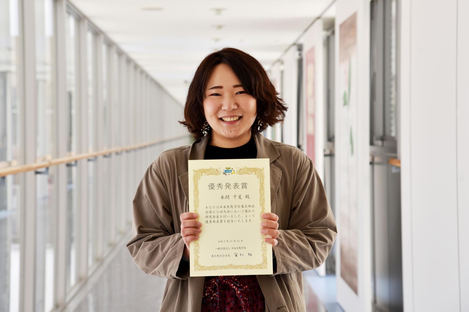 日本生態学会第65回東北地区大会(オンラインにより開催)において、大学院・生物資源科学研究科1年の本間千夏さん(森林科学研究室/生物環境科学科R2.3卒業)が優秀発表賞を受賞しました。本間さんは、森林科学研究室の星崎 和彦 教授の親身かつ丁寧な研究指導と研究室の先輩や仲間の協力のもと、直向きにコツコツと研究に取り組んだ結果、昨年に引き続き二年連続での受賞となる快挙を達成しました。
