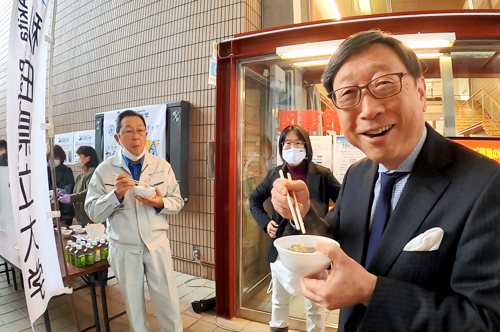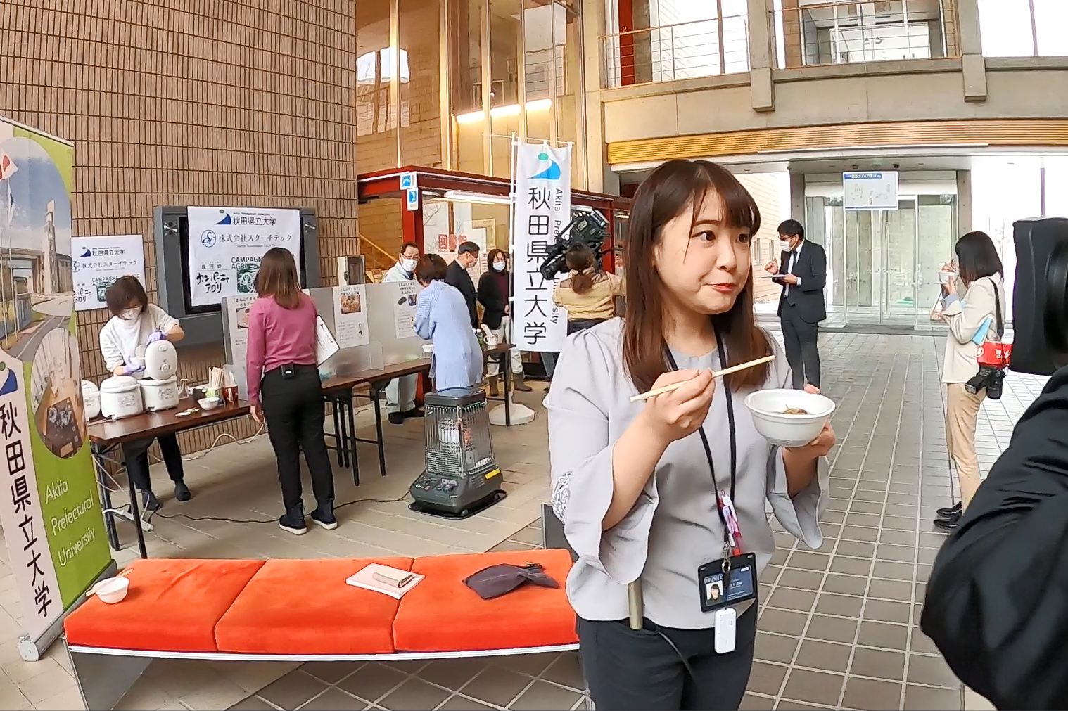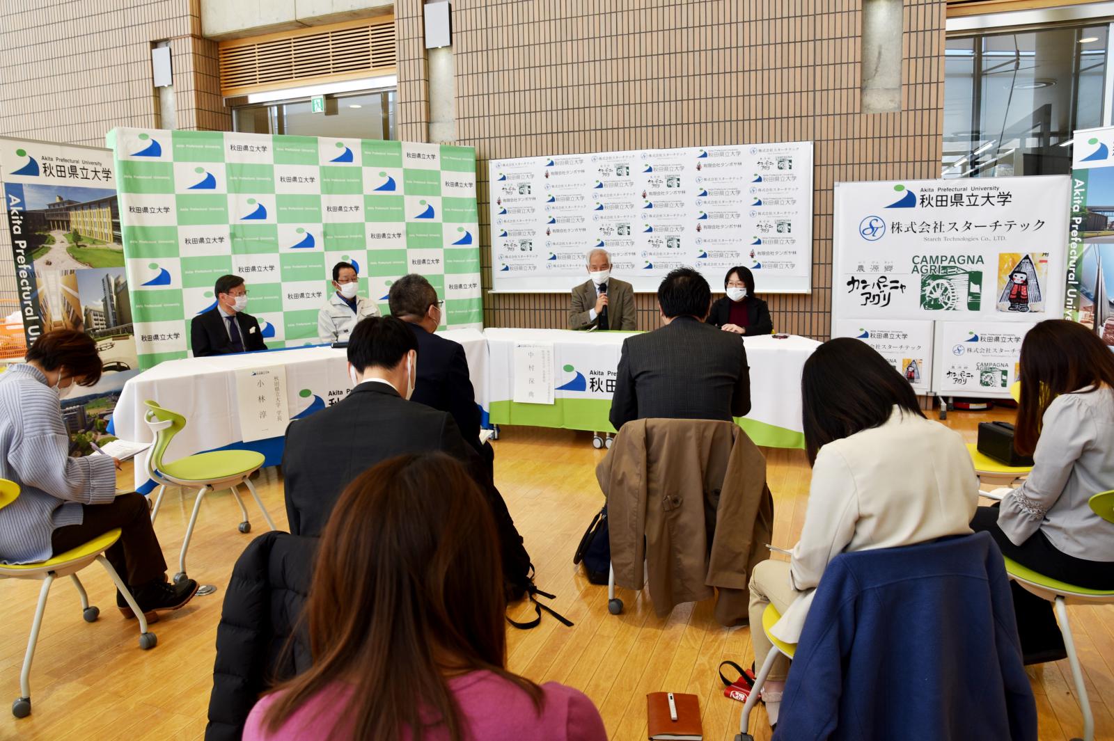 この度、生物資源科学部生物生産科学科の藤田 直子教授(㈱スターチテック取締役)の研究グループが中心となって開発した高レジスタントスターチ米『まんぷくすらり』の精米を使った「味噌」と、米粉ゲルを使った「きりたんぽ」を企業と共同で開発、来年1月中旬頃から県内のスーパーや土産物店で販売される運びとなり、12月22日(火)、秋田キャンパスにおいてお披露目となりました。『まんぷくすらり』は、食物繊維と似た働きを持つ難消化性澱粉があきたこまちの約10倍程度高く、食後の血糖値上昇を抑制する効果があり、満腹感も得られる機能性米です。また難消化性澱粉は、血糖値上昇抑制という機能性以外にも、腸内環境の改善も期待できることから、2型糖尿病や糖尿病予備群、肥満に対しても有用性が期待されます。