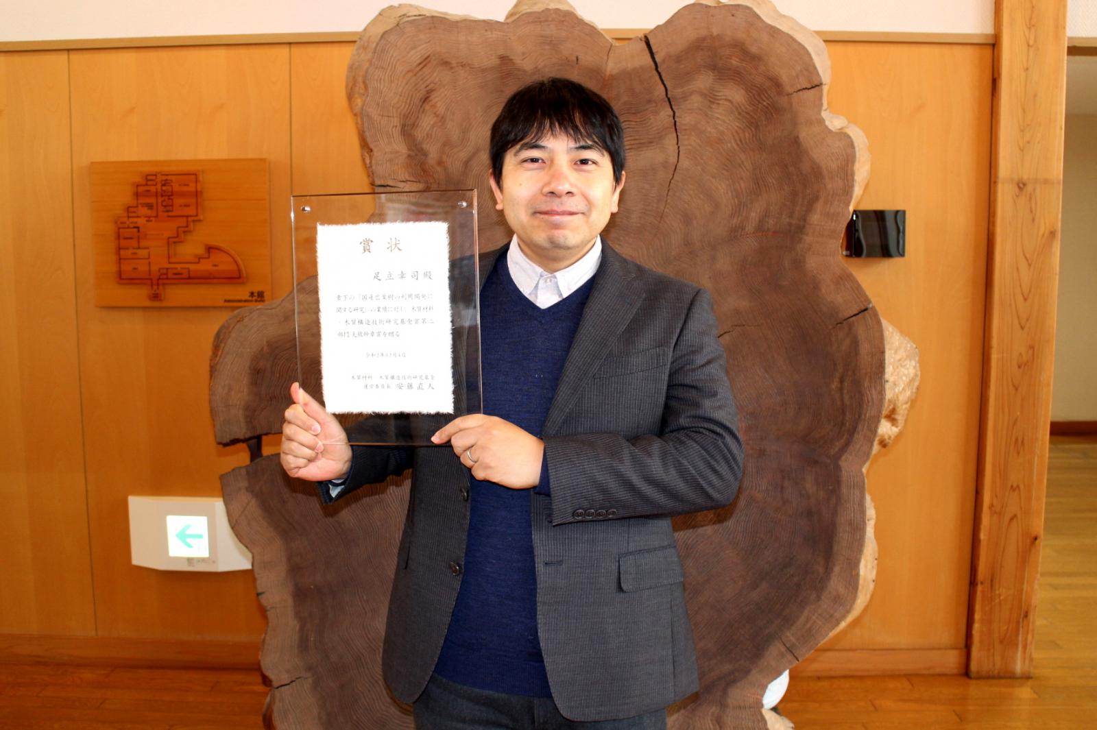 木材高度加工研究所の足立 幸司 准教授が、「第19回木質材料・木質構造技術研究基金賞:第二部門(大熊幹章賞)」を受賞しました。★研究テーマ 『国産広葉樹の利用開発に関する研究』