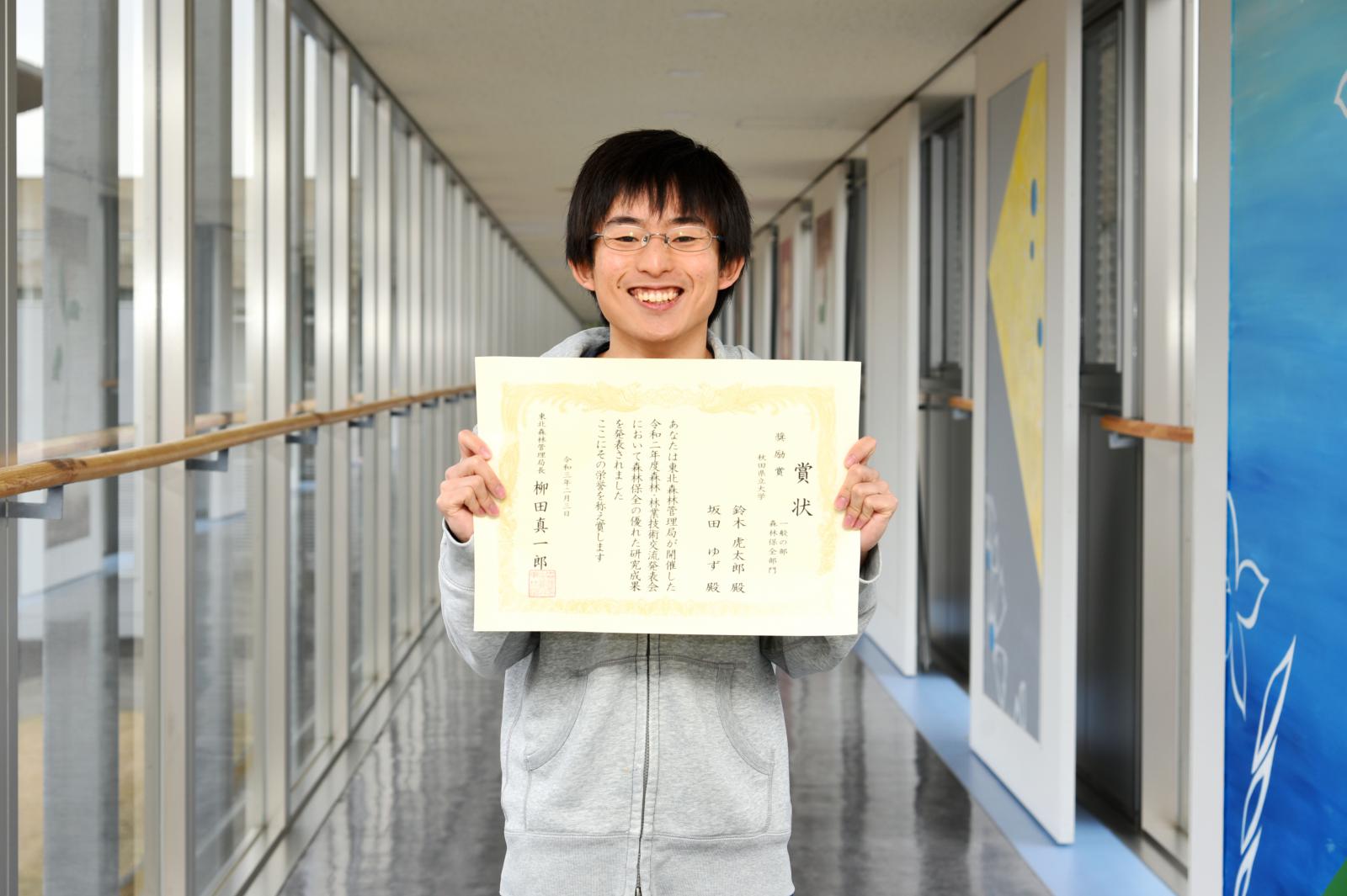 この度は素晴らしい賞をいただき誠にありがとうございます。大変嬉しく思います。 これも丁寧に研究を指導してくださる坂田先生をはじめとする森林科学研究室の方々のお力添えがあったからこそです。 素晴らしい環境で研究に取り組めていることに改めて感謝いたします。私は楽しむことをモットーに日々研究に取り組んでおります。 残り1年の大学生活を全力で楽しみ、研究を今まで以上に面白いものにできるように頑張ります。