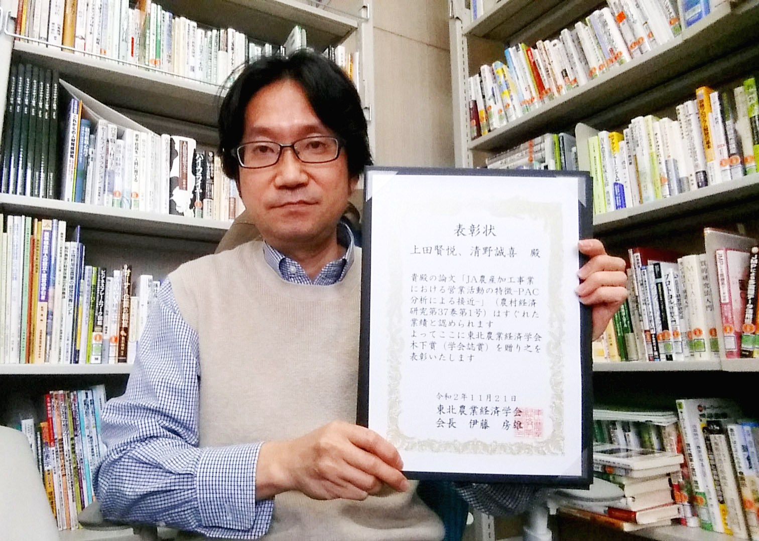 11月20日~21日にかけてオンラインで開催された「東北農業経済学会福島大会」において、生物資源科学部アグリビジネス学科の上田 賢悦 准教授(専門:農業経営学)らの発表論文が、2019/20 年度学会誌賞を受賞しました。この賞は東北農業の発展に貢献しうるすぐれた農業経済関係の学術著書・論文に贈られる賞で、上田准教授らは営業活動という全体像の把握が難しい取り組みを対象に、PAC 分析という心理学的手法で接近し定式化できている点に、新規性が認められて高く評価されました。この分野および手法を使った、今後の研究展開も期待されます。