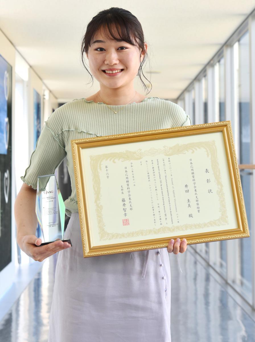 7月11日(日)、オンライン形式で開催された日本応用糖質科学会東北支部会において、大学院・生物資源科学研究科の井田 圭美さん(博士前期課程2年)さんが奨励賞を受賞しました。井田さんは、指導教員の藤田 直子 教授の指導の下、直向きに熱意を持ち続け、コツコツと研究に取り組んだ結果、本賞の受賞に繋がりました。★研究発表タイトル・発表者