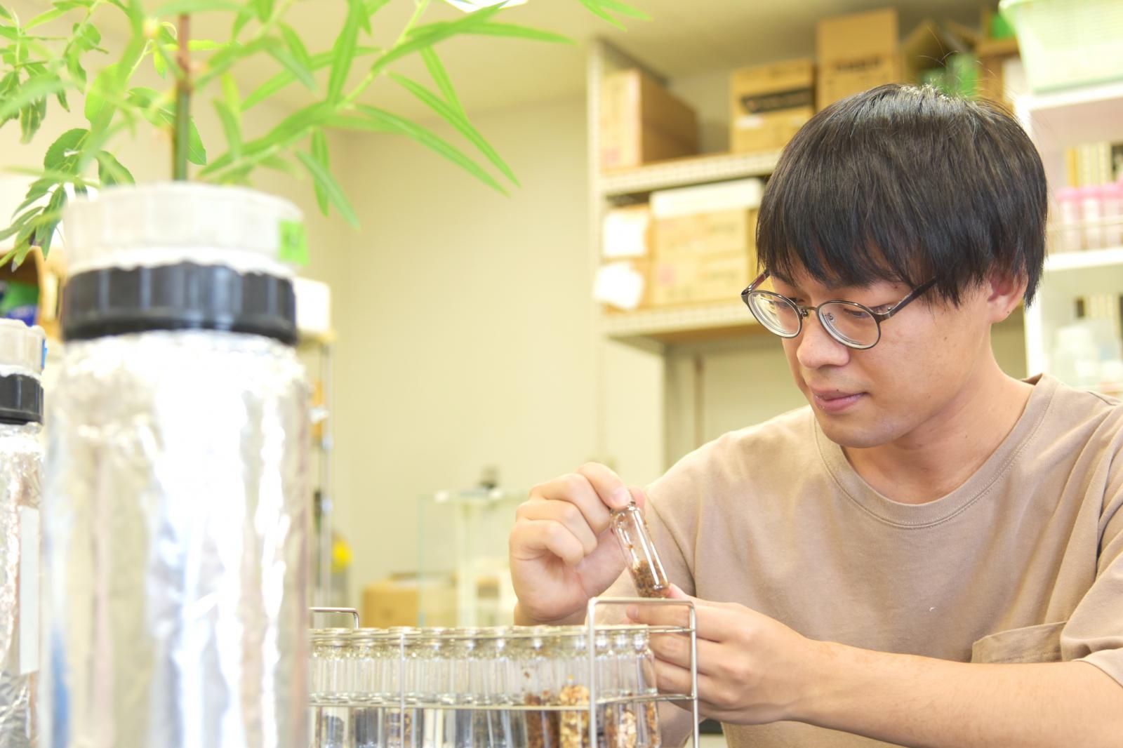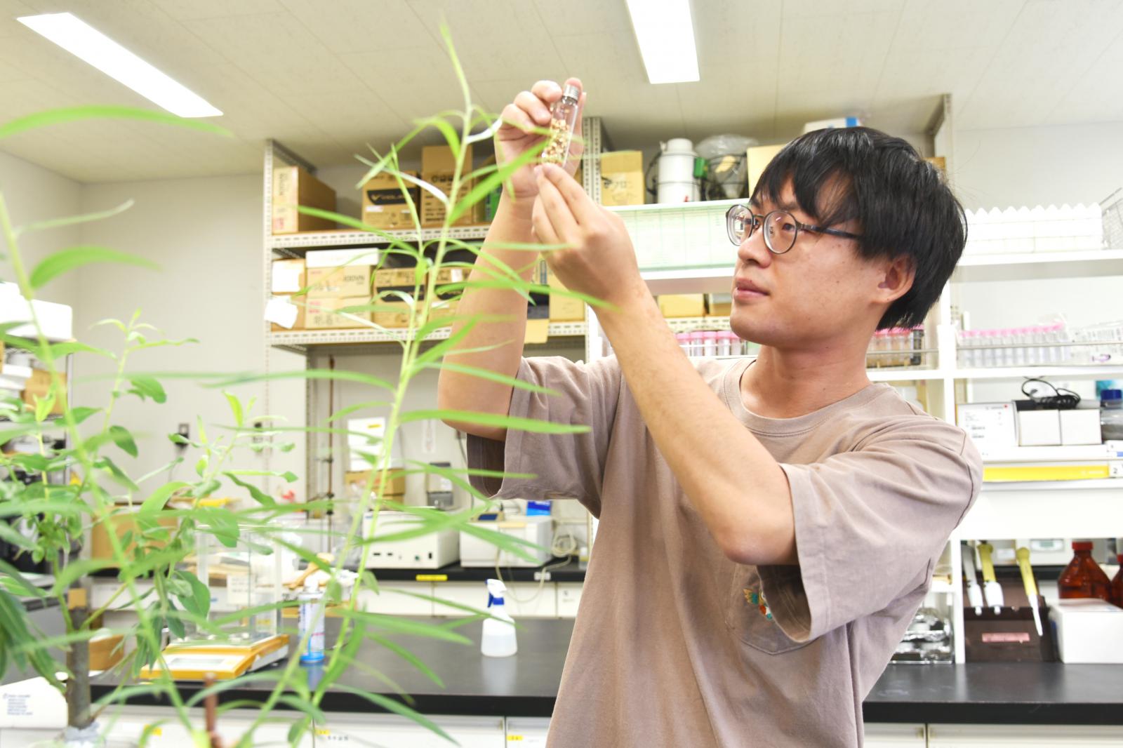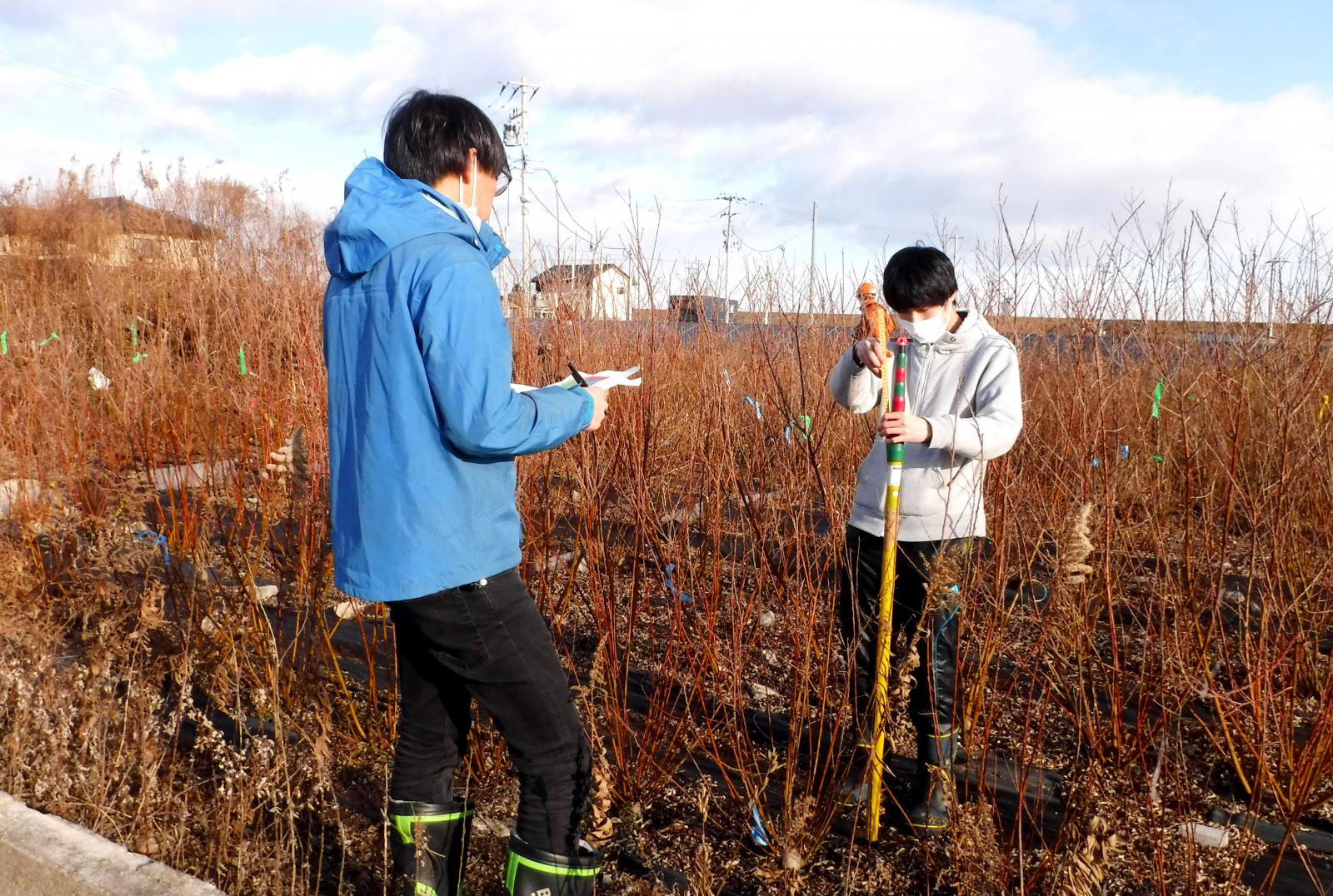 ファイトレメディエーション (Phytoremediation)は、植物を用いて環境中の有害物質を除去する技術です。除去には様々な植物の機能が関与しており、根から有害物質を取り込んだ後の蒸散、植物体内での代謝や蓄積、または植物根での固定や根圏微生物による分解などが挙げられます。1,4-ジオキサンは、発がん性の疑いがあるVOC (揮発性有機化合物)の一種で、高い親水性や難分解性などの要因から環境中における除去が困難な物質です。私は、エネルギー作物や緑化樹木として注目されている早生ヤナギを使った、1,4-ジオキサンのファイトレメディエーションについて研究しています。今回は、1,4-ジオキサンを含んだ水耕液で3品種のヤナギを栽培し、1,4-ジオキサンの除去効率が高い品種の選出と、除去に寄与する植物機能 (蒸散、代謝、蓄積)について寄与の割合を調査しました。