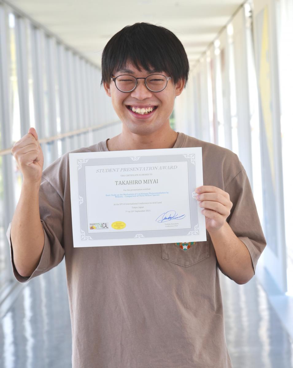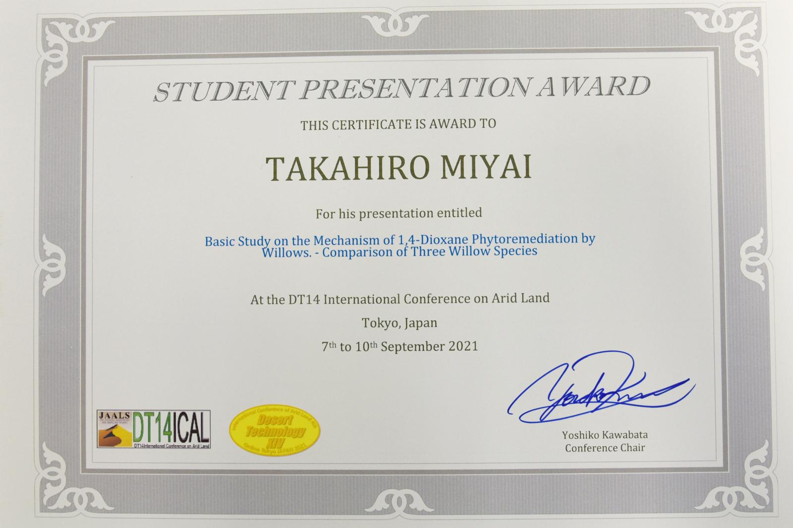 9月7日~10日にオンライン形式で開催された、DTXIV International Conference of Arid Land Studies, September 7th-10th, 2021, Tokyo(乾燥地に関するDTXIV国際会議)において、大学院・生物資源科学研究科(博士前期課程1年)の宮井 隆大さん(自然生態管理学研究室)が発表賞を受賞しました。宮井さんは、指導教員の石川 祐一 准教授の指導の下、熱意を持ち直向きにコツコツと研究に取り組んだ結果、本賞の受賞に繋がりました。<発表タイトル・発表者>