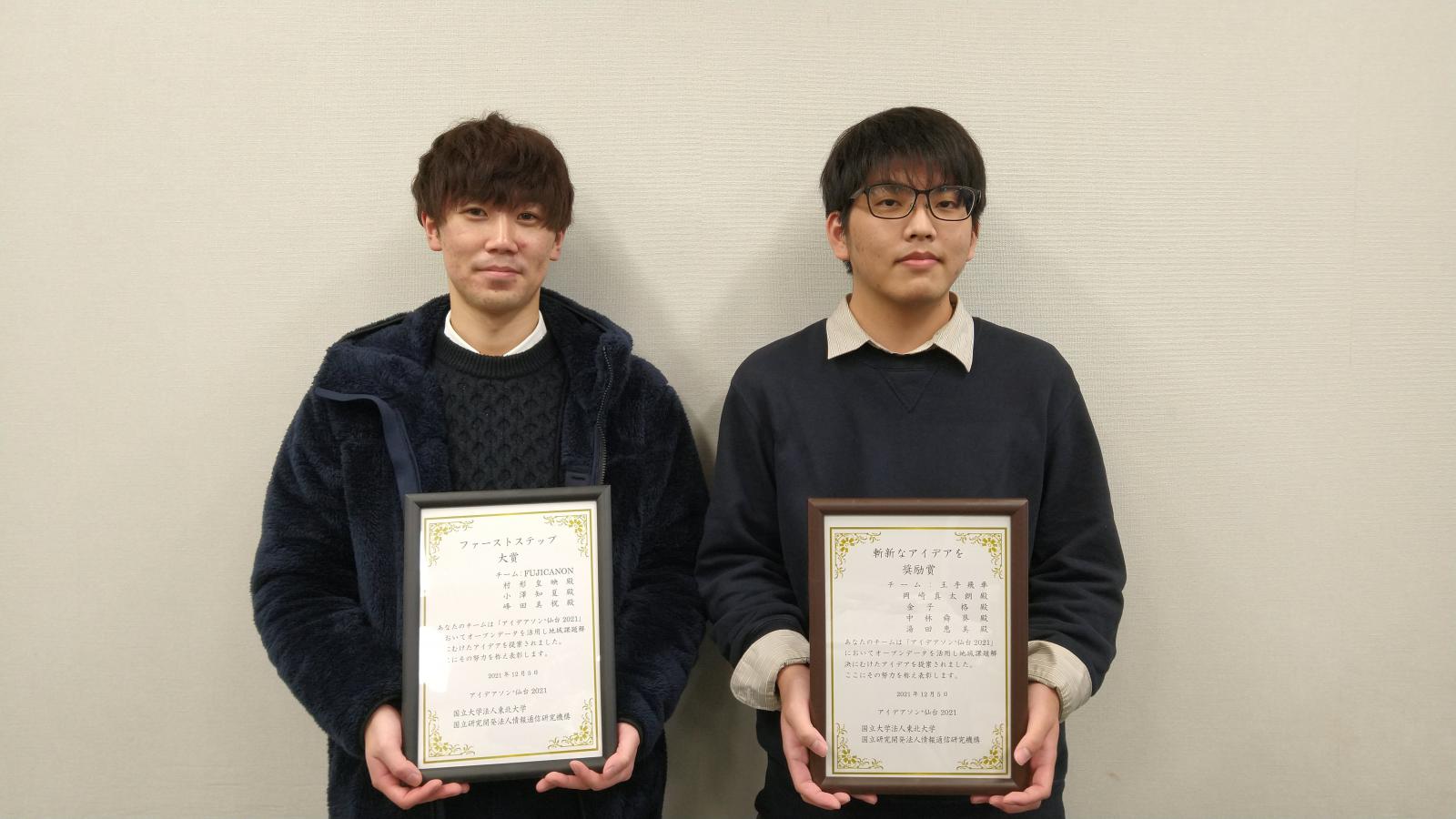 2021年12月4日-5日にオンラインで実施された「アイデアソン+仙台 2021」に情報工学科3年の中林舜葵さんと村形皇映さんが参加しました。このイベントは、東北の魅力発信、地域課題解決にオープンデータを利活用した新しいアプリやサービスを検討・提案したり、必要なオープンデータの提案を行うアイデアソンです。2人とも初対面かつオンラインでのチーム作業となりましたが、短い時間の中で素晴らしい提案およびプレゼンを作成し、審査の結果、中林舜葵さんが、独創性が最も優れているアイデアに授与される「斬新なアイデアを奨励賞」を、村形皇映さんが社会課題、地域課題解決に繋がる第一歩がイメージできるアイデアに授与される「ファーストステップ大賞」を受賞しました。