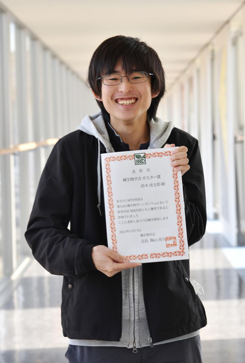 12月3日(金)~5日(日) 、オンライン形式により開催された「第53回種生物学会シンポジウム」において、大学院・生物資源科学研究科(博士前期課程2年)の鈴木虎太郎さん(生物環境科学科/森林科学研究室)が、種生物学会ポスター賞を受賞しました。鈴木さんは、森林科学研究室の強固なチームワークと、指導教員の坂田 ゆず 助教の親身かつ丁寧な研究指導の下、ニホンジカの食害問題についてコツコツ研究を継続して取り組んだ結果、本賞の受賞に繋がりました。