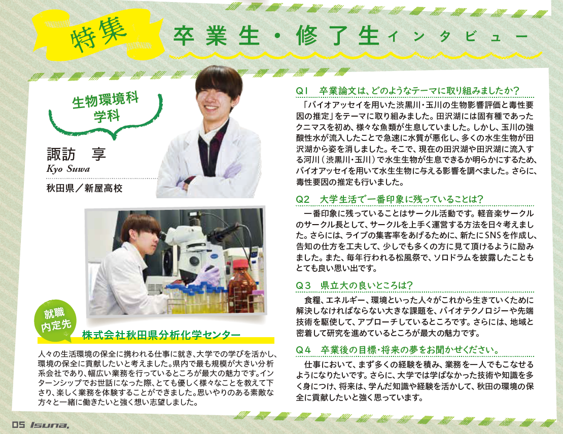 今回、国際学術誌「Ecotoxicology」に掲載して頂いたということで、まだ実感はわきませんが大変光栄に思います。これもご指導頂いた堀江先生をはじめ、研究にご協力してくださった高橋さん、研究環境を整えてくださった秋田県立大学のおかげだと強く思っています。私は「なぜクニマスが田沢湖から姿を消してしまったのか」ということを研究したくて、秋田県立大学に入学を決めました。そんな背景があってこそ、今回の国際学術誌への掲載、本当に嬉しいです。改めて、ご指導、ご協力頂いた皆様、本当にありがとうございました。