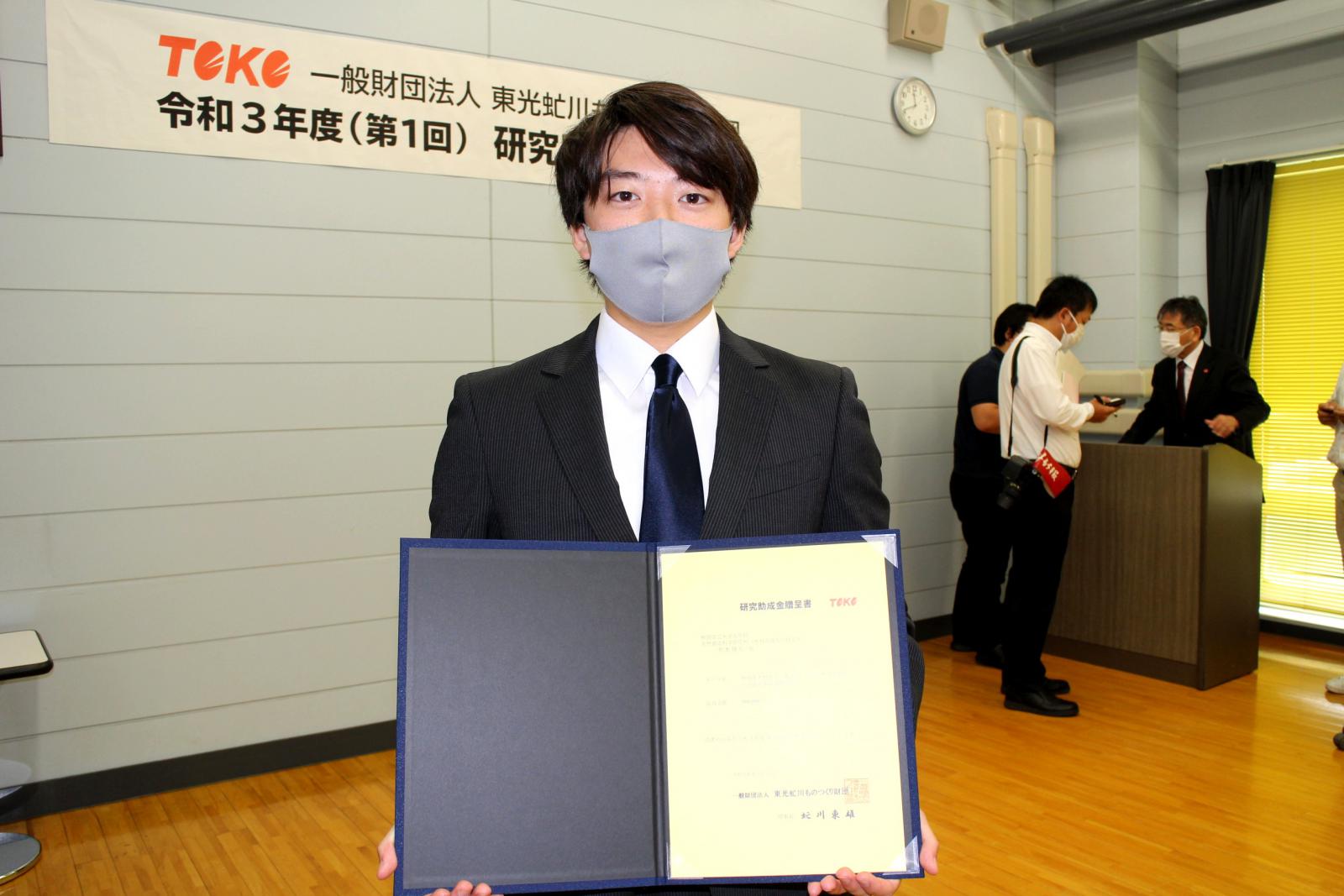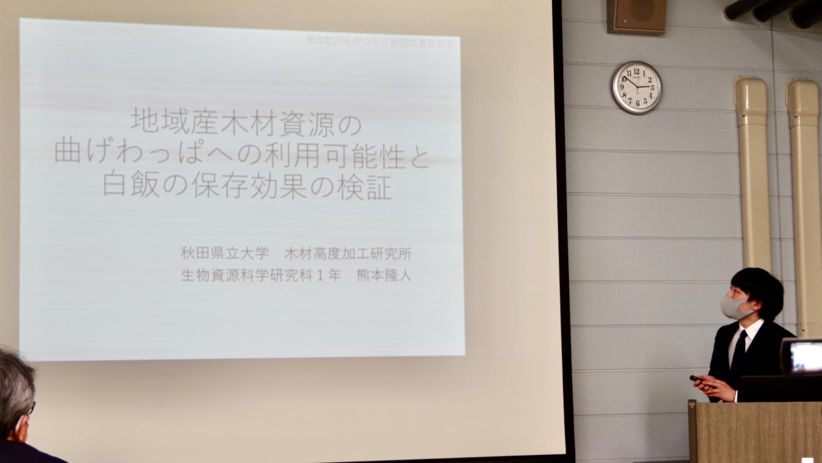 3月25日(金)、東光鉄工本社で、「一般財団法人東光虻川ものつくり財団研究助成金事業」の研究成果発表会が開催され、本学生物資源科学研究科 博士前期課程1年の熊本隆人さん(指導教員:木材高度加工研究所 足立 幸司 准教授)が研究成果を発表しました。本助成金事業は、一般財団法人東光虻川ものつくり財団が、ものつくりの発展を促進するための支援及び環境整備を図ることにより、地域振興の促進、地域社会の健全な発展及び地域住民の生活の向上に寄与することを目的に2019年2月に設立され、今回が初めての助成事業となります。