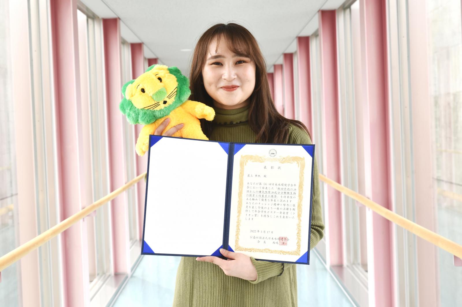 令和4年3月16日~18日にオンライン形式により開催された、日本水環境学会第56回年会において、大学院・生物資源科学研究科1年の最上 華帆 さん(発表当時、生物環境科学科4年生/生態工学研究室)が「年会学生ポスター発表特別賞(ライオン賞)」を受賞しました。最上さんは、指導教員の 渡邊 美穂 助教の指導の下、直向きに熱意を持ち続け、コツコツと研究に取り組んだ結果、本賞の受賞に繋がりました。表彰者は最上さんを含めて17名で、プレゼンテーションや優れた研究成果として高く評価されました。