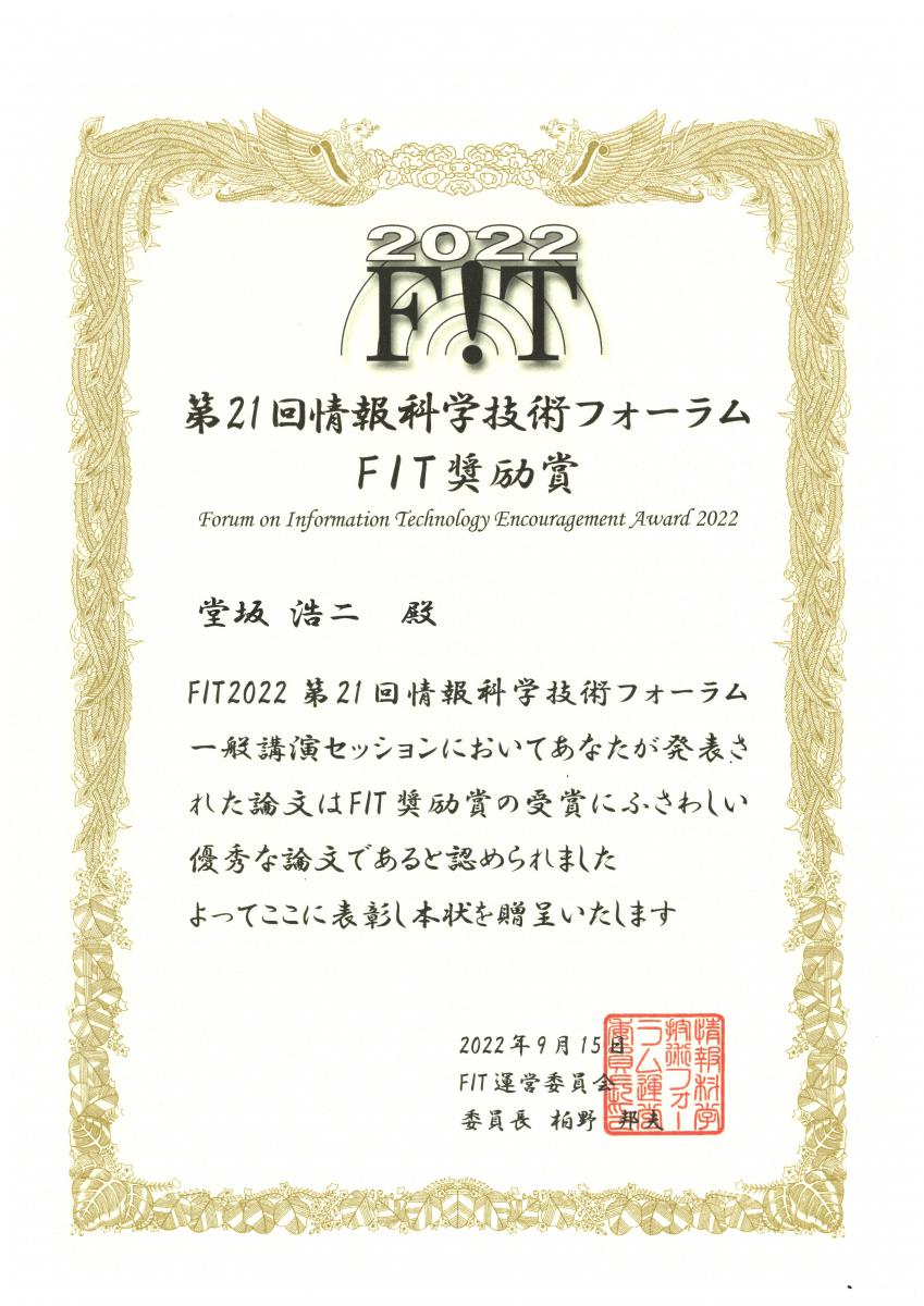 【賞状】第21回情報科学技術フォーラムFIT奨励賞