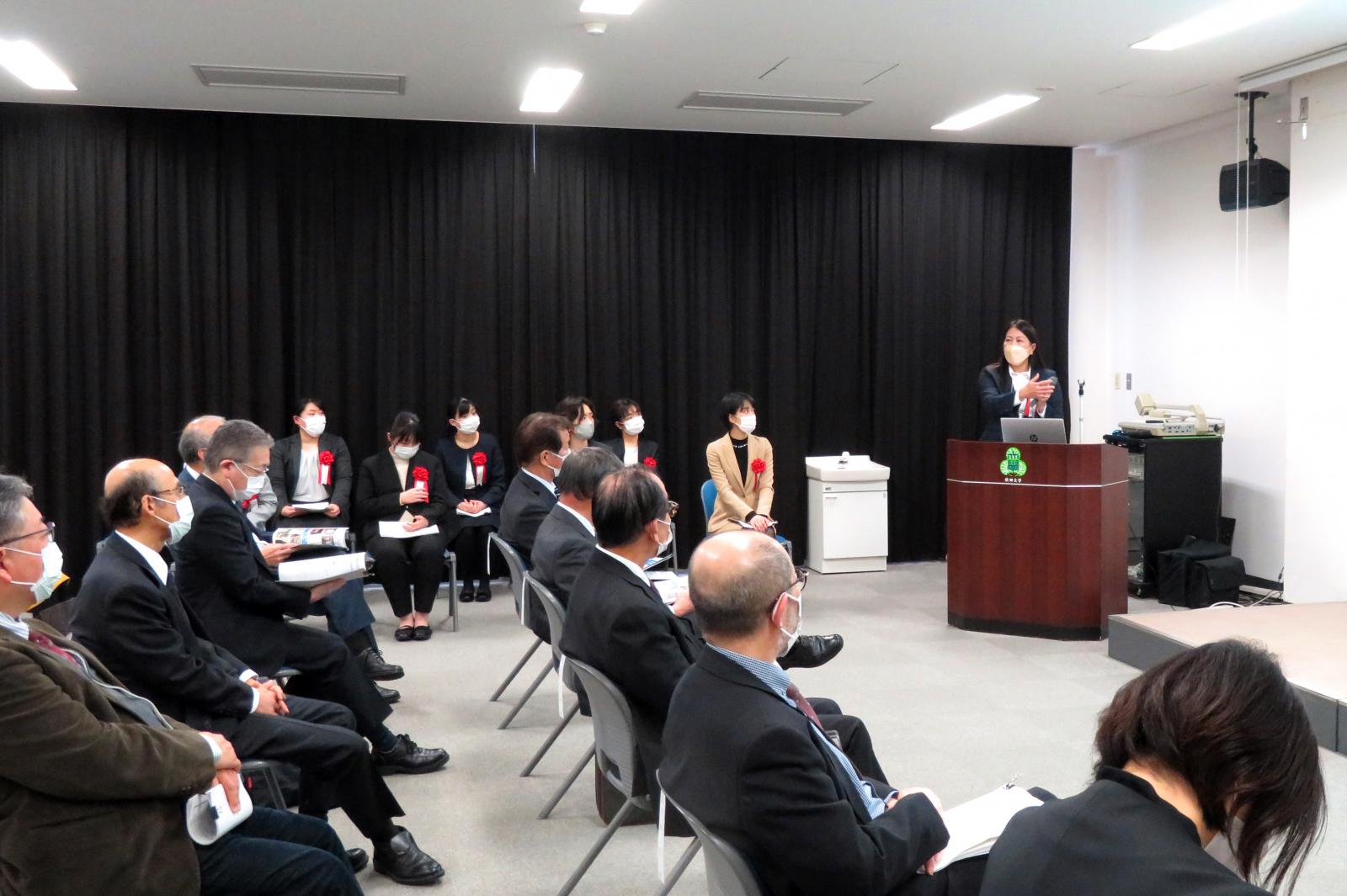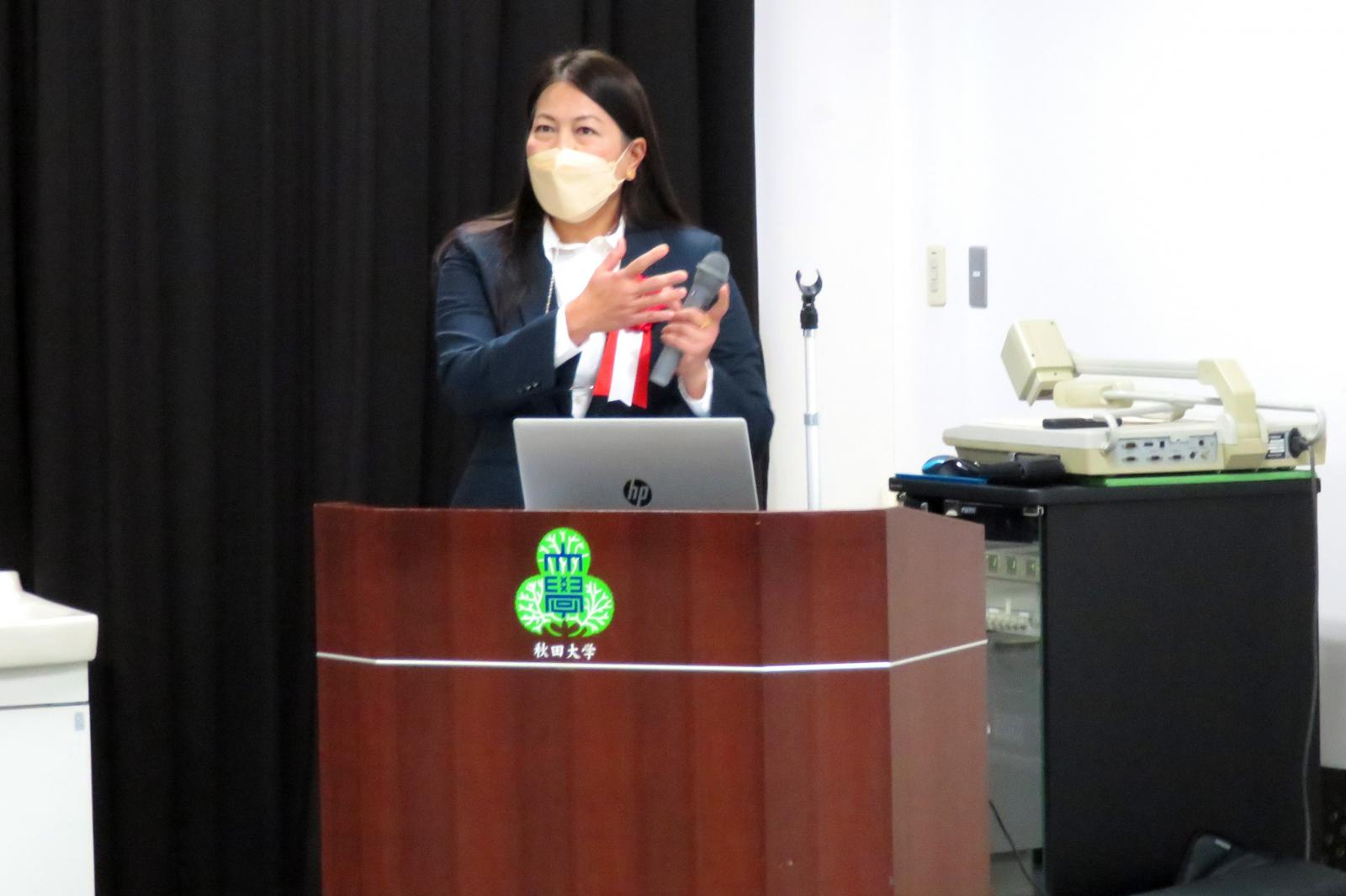 このたび、生物資源科学部生物生産科学科のメイ・サン・アウン特任助教が、「女性研究者支援コンソーシアムあきた賞(ワークライフバランス)」を受賞され、令和4年12月20日(火)、秋田大学手形キャンパスにて表彰式及び受賞記念講演が開催されました。受賞されたメイ先生は、ミャンマー出身で、現在、二人のお子さんの育児をしながら、日々研究を行っています。受賞記念講演では、「コメの鉄栄養価の向上及びイネの鉄過剰耐性機構における分子メカニズムの解明」と題し、自身の研究内容を講演しました。