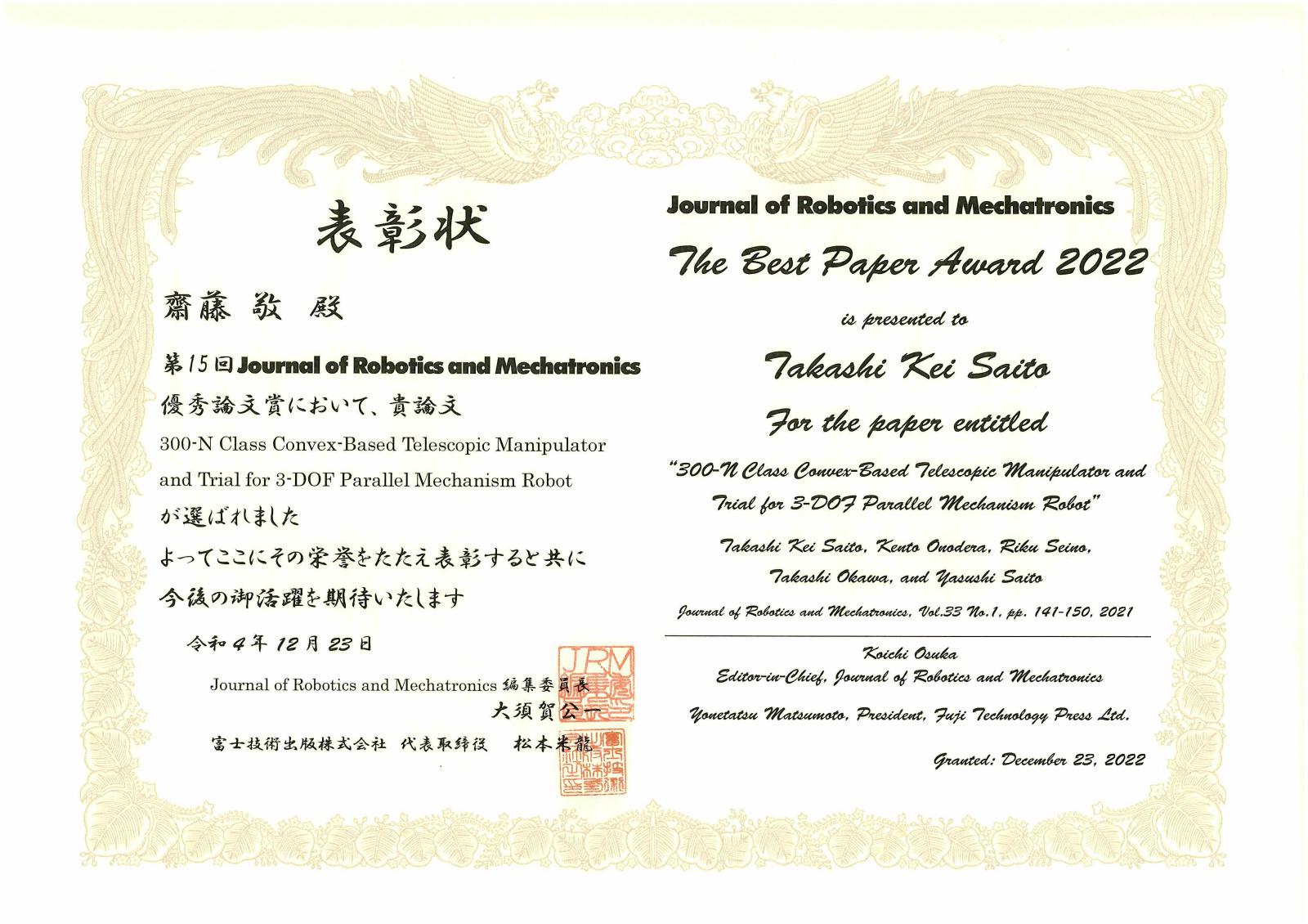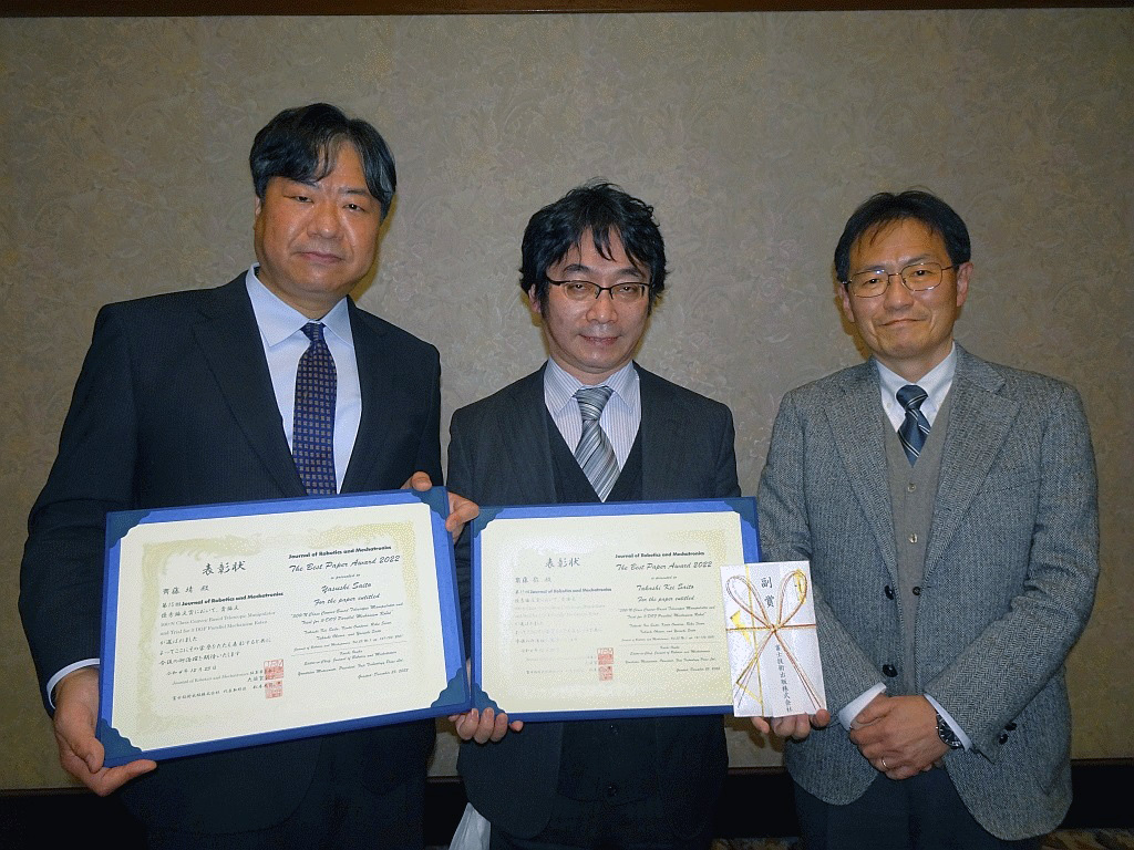 本学教員と企業との共同研究成果が「Journal of Robotics and Mechatronics誌」の”The Best Paper Award 2022”を受賞しました