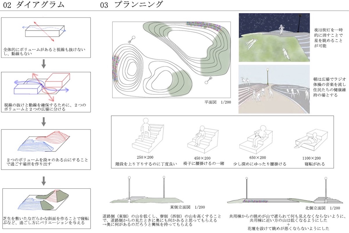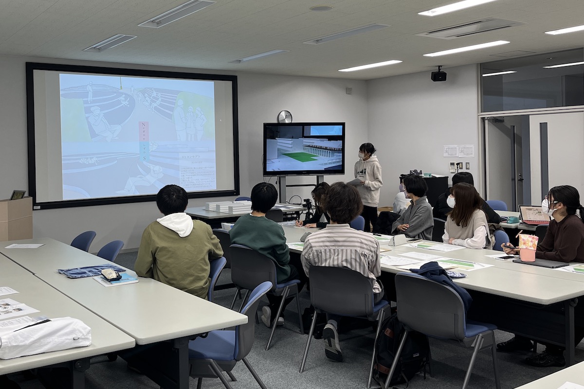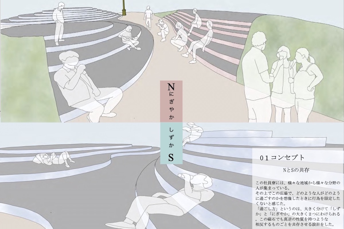 TDKが整備をすすめている由利本荘市一番堰の社員住宅を中心としたまちづくりプロジェクトに、建築環境システム学科計画学講座の教員4名(山口 邦雄 教授、込山 敦司 准教授、石山 真季 助教、李 雪 助教)ならびに学生達が協力しています。今年度は一番堰に整備される住居と交流施設と食堂を兼ねたシェアスペースの前の広場のデザイン案検討を依頼されました。昨年10月から複数回のワークショップを開催し、込山 准教授、石山 助教、李 助教の指導による3グループにわかれて、TDKの若手社員も参加して3つのアイデアを検討しました。実現性や安全性なども踏まえて施工業者や担当設計事務所による検討が行われ、採用案(グループA案:大学院生の鈴木 かれん さん、学部3年生の伊藤 香乃 さん、佐々木 彩乃 さん、二瓶 真凜 さん、小田川 塁 さん、三河 翔太 さんによるグループ、ファシリテーター:込山准教授)が決定されました。