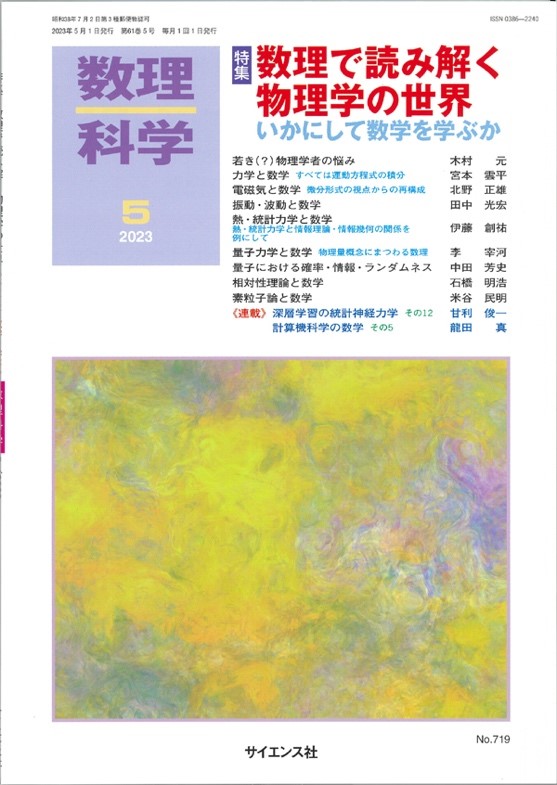 2023年5月号では「数理で読み解く物理学の世界〜いかに数学を学ぶか〜」という特集が組まれ、研究と教育に力を注ぐ物理学者達が、物理学の諸分野(力学・熱力学・電磁気・量子力学etc)における数学の役割を解説すると共に、若手に向けて数学との付き合い方を指南しています。
