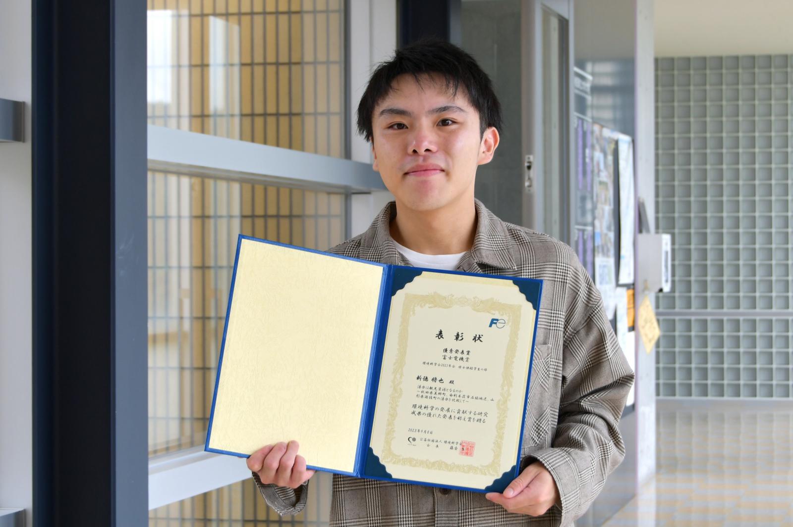 本学大学院・システム科学技術研究科 共同サステナブル工学専攻 博士前期課程2年の新徳 将也さん[指導教員:金澤 伸浩 准教授[環境工学]が、9月7日(木)~ 8日(金)に神戸大学で開催された、公益社団法人 環境科学会が主催する「環境科学会 2023年会」で研究発表を行い、優秀発表賞(富士電機賞)を受賞しました。おめでとうございます!!環境科学会は、環境科学に関する諸問題を学際的かつ総合的に調査・研究し、環境科学の学術文化の発展に寄与するとともに、これらの成果の普及・啓発に努め世界の環境保全や創造に貢献することを目的とした学会で、同賞は、年会における研究成果発表の中から、優秀な発表を行った若手研究者および学生に贈られる賞です。