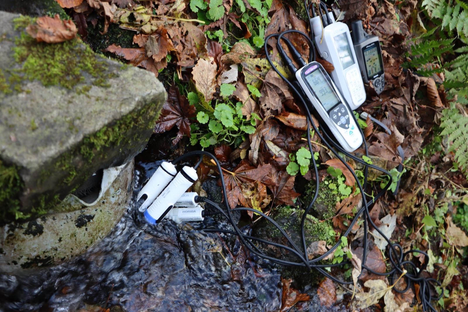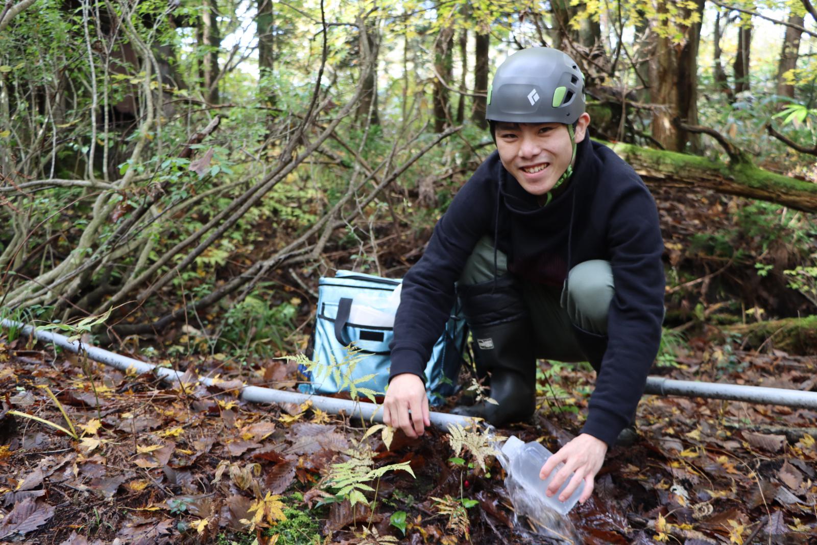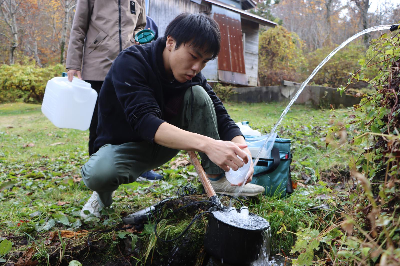 鳥海山で湧水をサンプリング