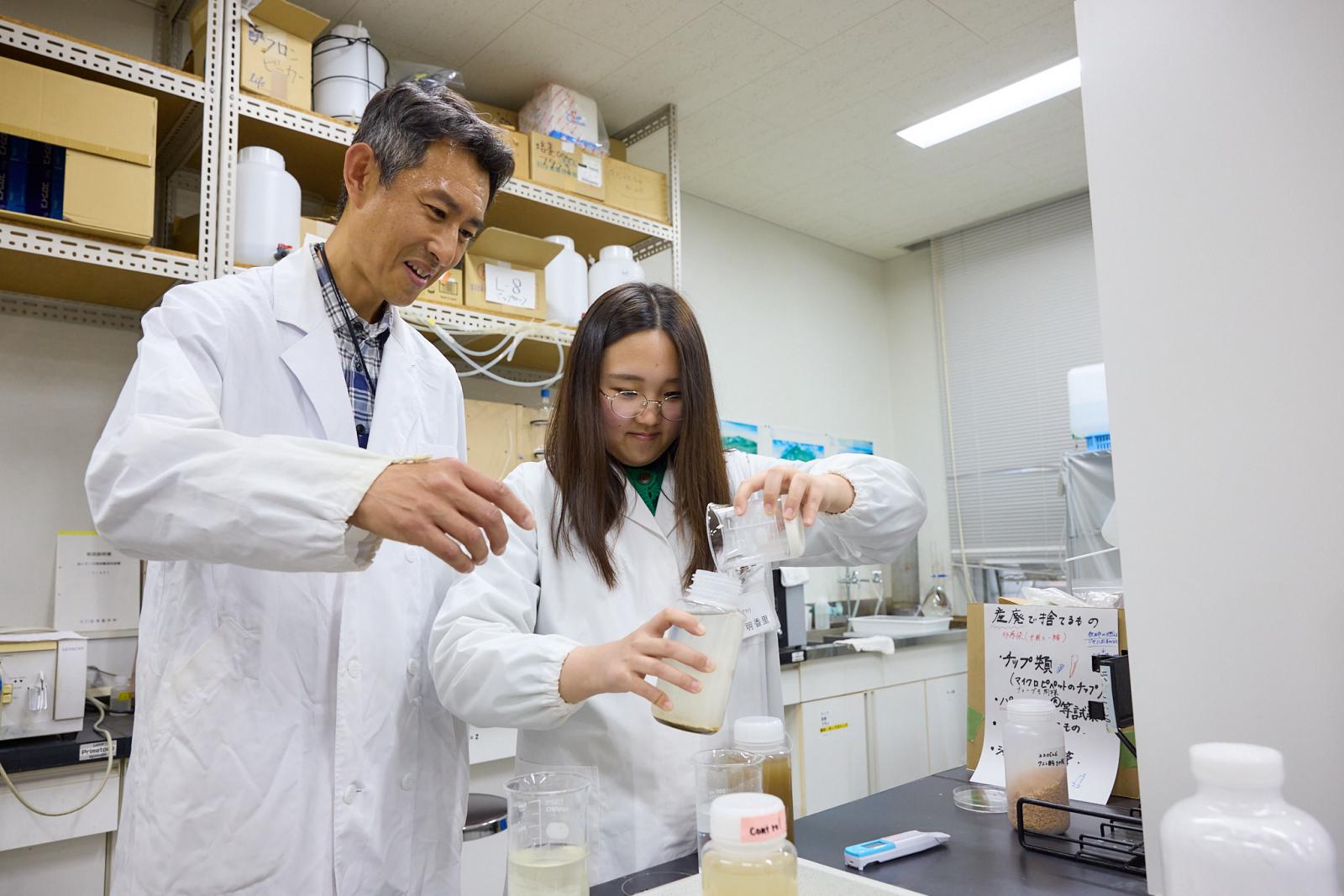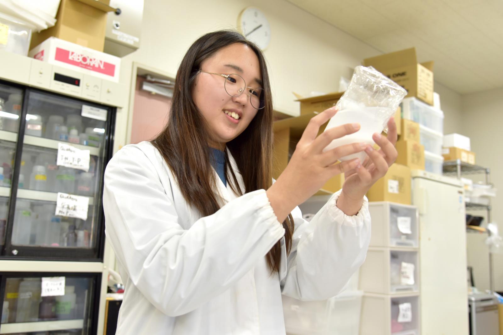 学部4年次から行ってきた研究を外部の方から評価していただき大変嬉しく思います。はじめは、くん炭からどうやって非晶質ケイ酸カルシウム水和物を作ればよいのだろうかと悩み、試行錯誤を重ねました。今後も、「くん炭CSH」について研究を進め、秋田県の環境に有用な資材、肥料開発ができるよう研究に邁進してまいります。