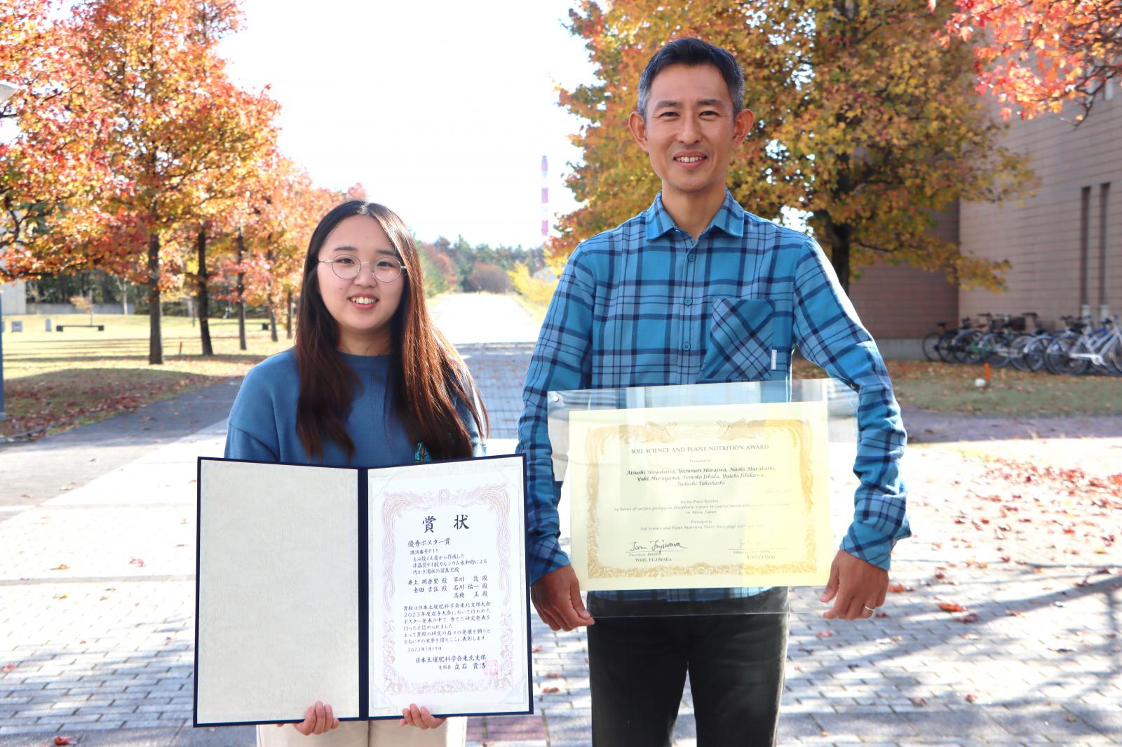 本学大学院・生物資源科学研究科 博士前期課程2年の井上 明香里さん(自然生態管理学研究室)が、7月19~20日、岩手県アイーナいわて県民情報交流センターで開催された、日本土壌肥料学会東北支部大会(2023年度)においてポスター賞を受賞しました。また、井上さんの指導教員である生物資源科学部 生物環境科学科の早川 敦 准教授[専門:生物地球化学]が、9月13日、愛媛県県民文化会館で開催された日本土壌肥料学会2023年度愛媛大会において、「日本土壌肥料学会SSPN AWARD(欧文誌論文賞)」を受賞しました。